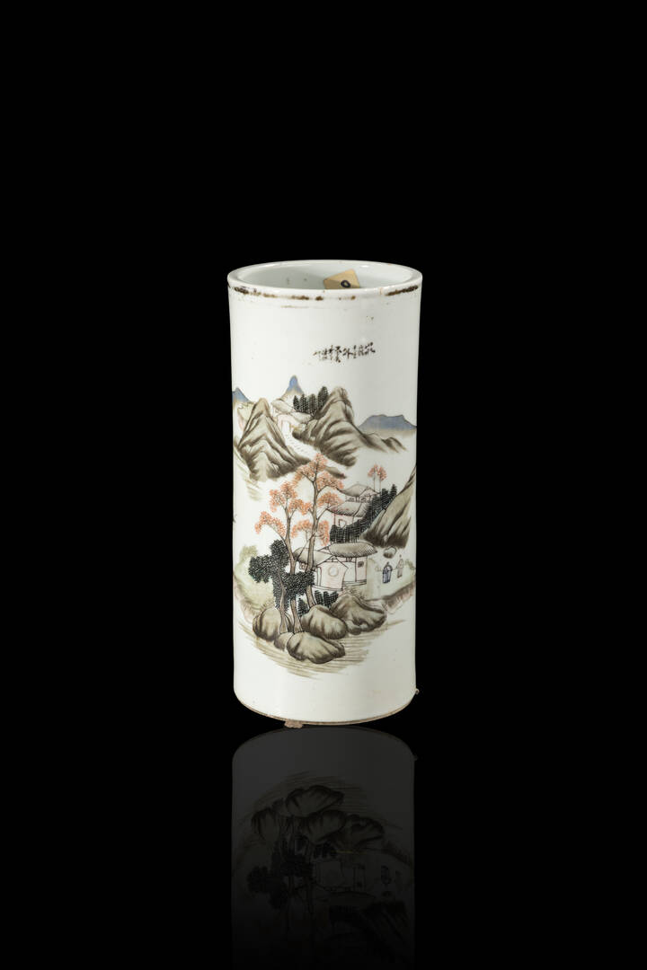 Porta cappello in porcellana Famiglia Rosa decorato con paesaggio, Cina, dinastia Qing XIX Sec.