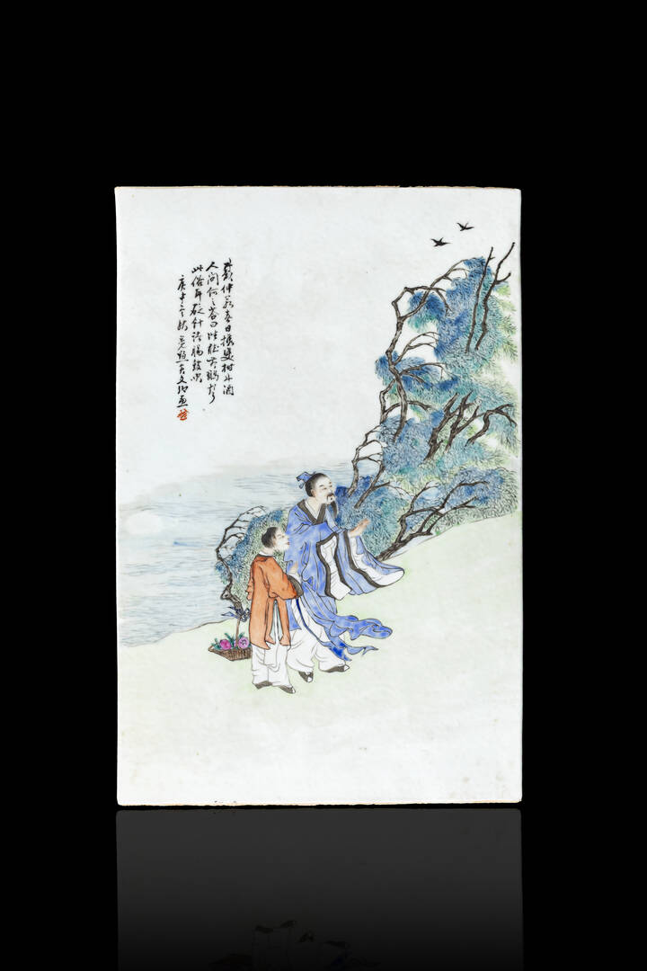 Placca in porcellana Famiglia Rosa decorata con personaggi e iscrizioni. Cina dinastia Qing XIX sec.