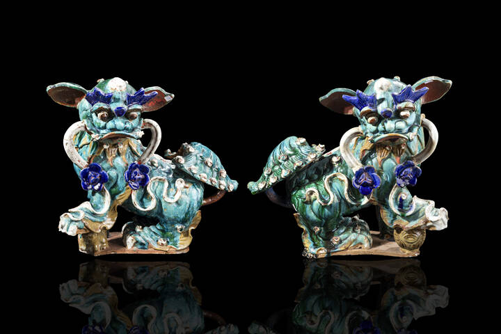 Coppia di grandi cani di Pho, in gress policromo Cina dinastia Qing XIX sec