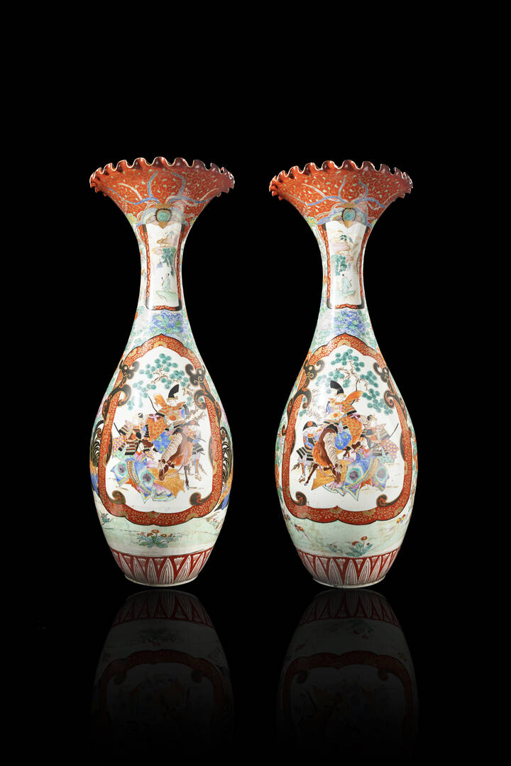 Coppia di grandi vasi a tromba in porcellana Kutani, Giappone XIX Sec.