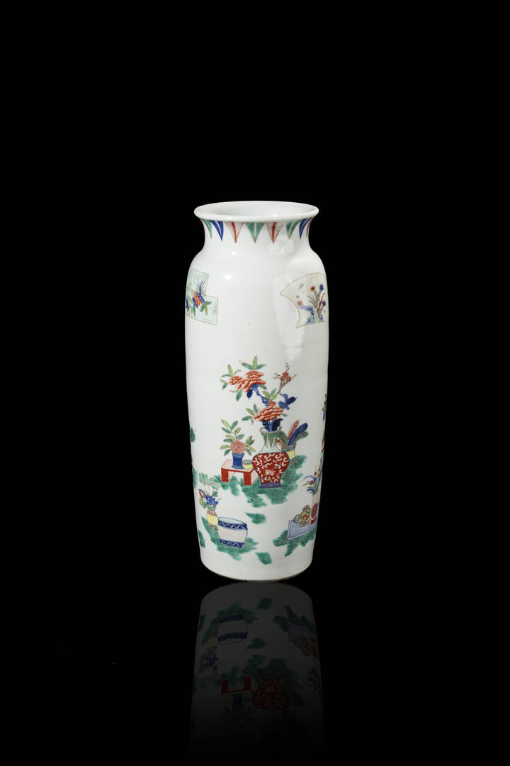 Vaso cilindrico in porcellana Ducai decorato con vasi in giardino e personaggi entro riserve, Cina, Repubblica XX Sec.