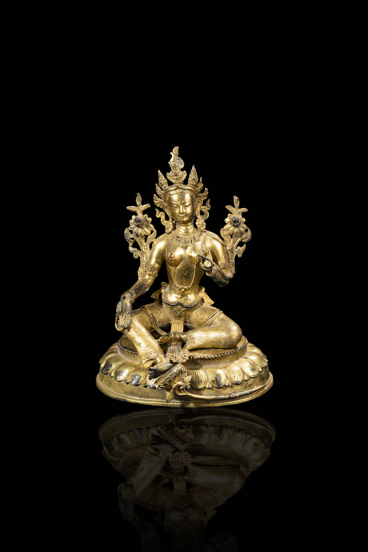 Scultura in bronzo dorato rappresentante Buddha seduto nella posizione del loto. Cina, Dinastia Qing XIX sec.