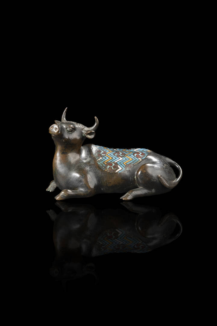 Scultura di bue in bronzo con inserti in cloisonnè.