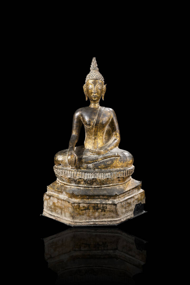 Buddha in bronzo patinato seduto nella posizione del loto. Laos XIX sec.