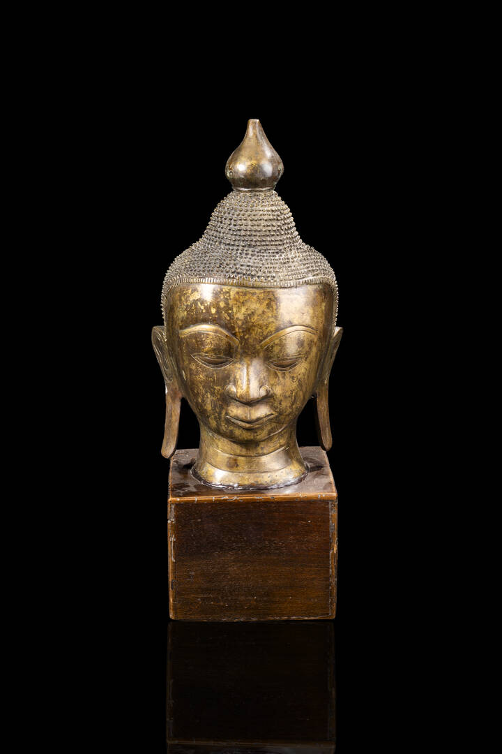 Testa in bronzo patinato rappresentante Buddha. Thailandia XIX sec.