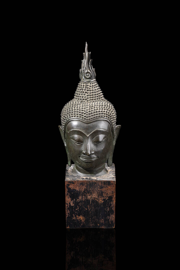 Testa in bronzo brunito rappresentante Buddha. Thailandia XIX sec.