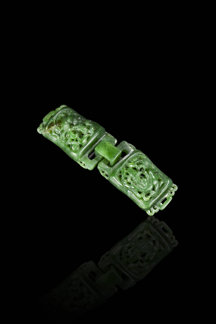 Fibbia in giada spinacio con decoro di draghi. Cina, dinastia Qing XIX sec