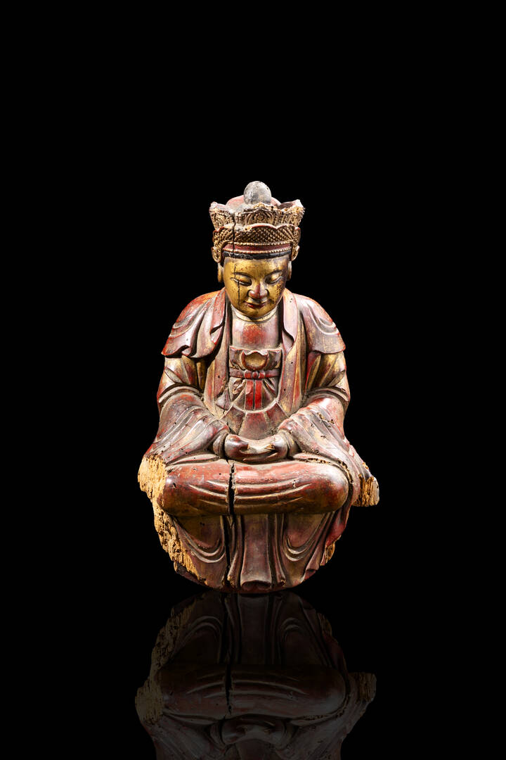 Scultura di Buddha in legno laccato seduto nella posizione del loto. Cina, Dinastia Ming XVII sec.
