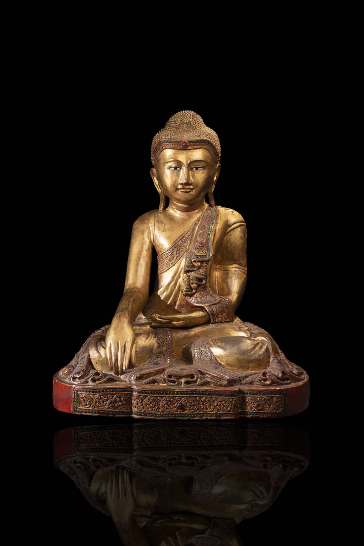 Buddha in legno dorato con intarsi in vetro seduto nella posizione del loto, Thailandia inizi XX Sec.