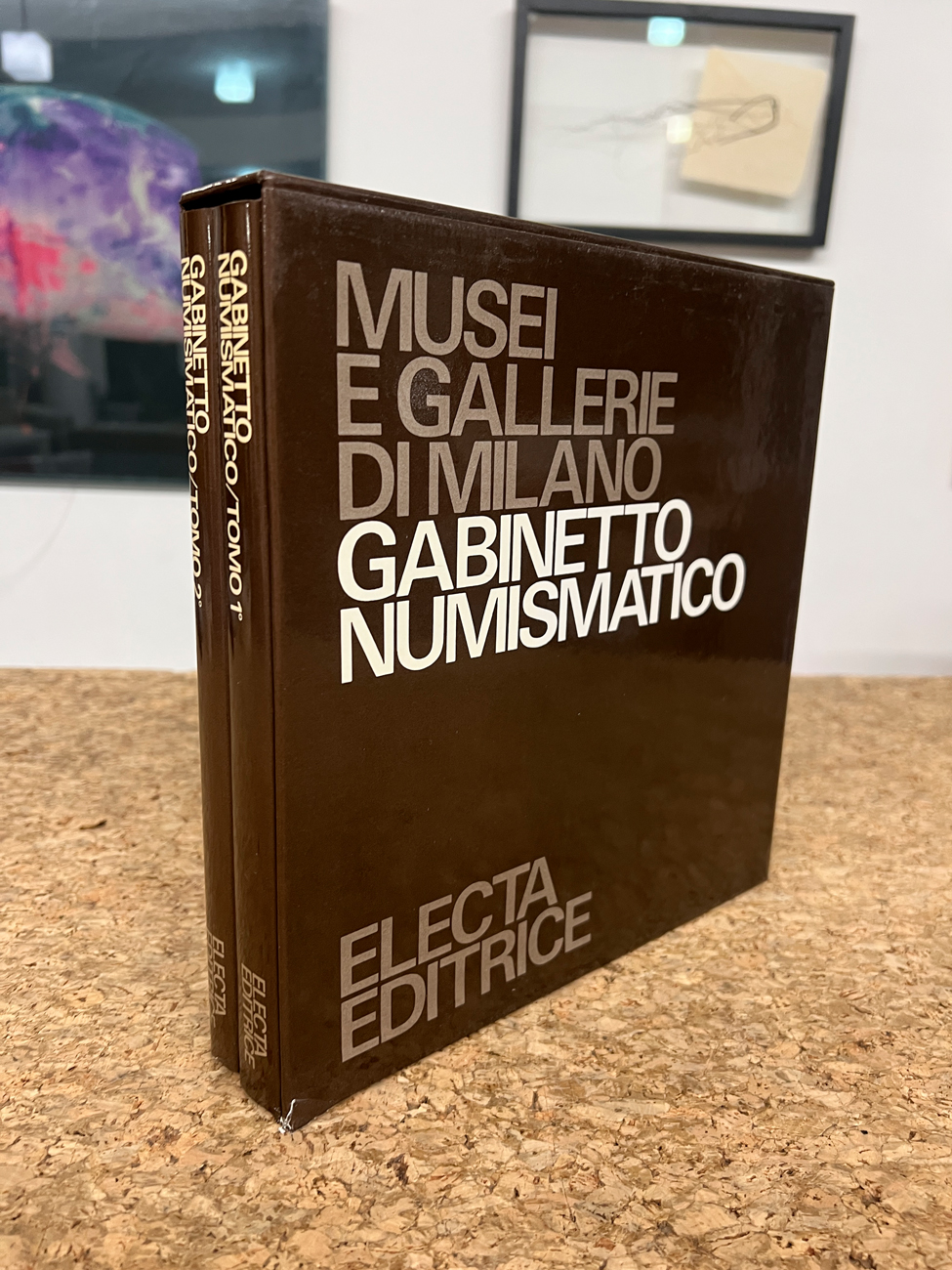 Cofanetto contenente due cataloghi riccamente illustrati, a cura di Gian Guido Belloni, relativi al Civico Gabinetto Numismatico di Milano (Medagliere, secondo la dizione corrente), con sede al Castello Sforzesco
