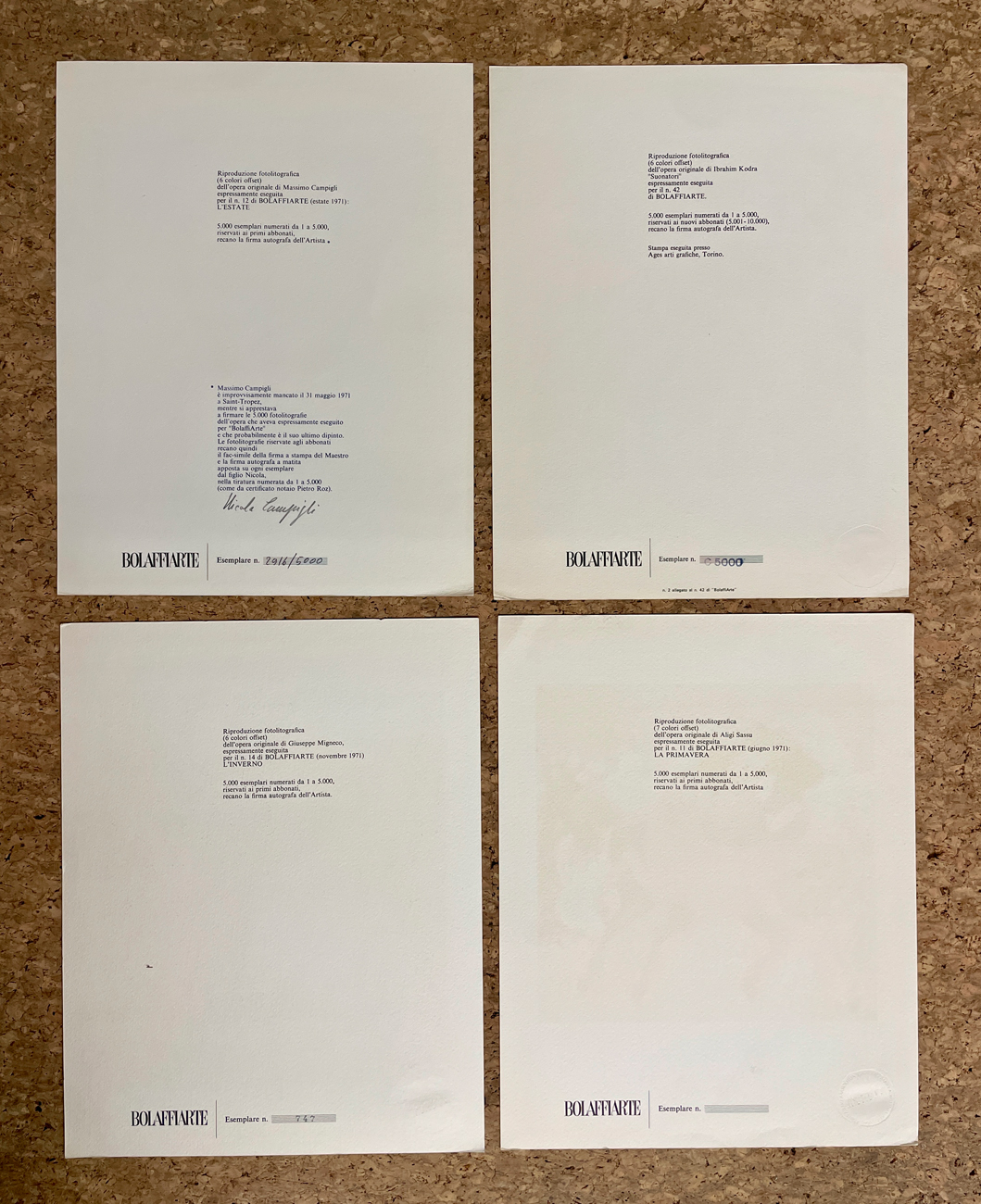 EDIZIONI BOLAFFIARTE (MIGNECO, KODRA, CAMPIGLI E SASSU) - Lotto unico di 4 fotolitografie