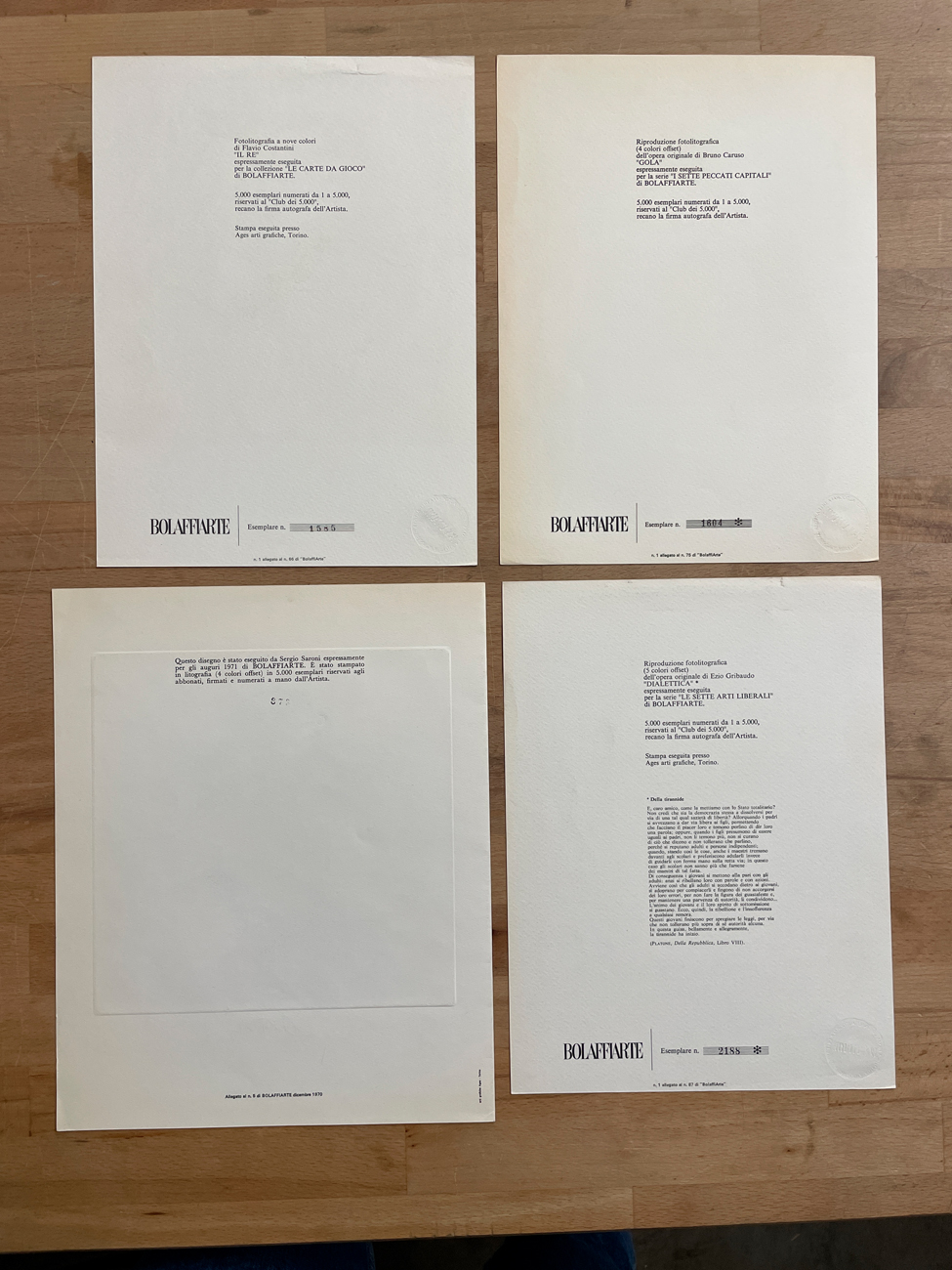 Lotto 276 | EDIZIONI BOLAFFIARTE (GRIBAUDO, COSTANTINI, CARUSO E SARONI) - Lotto unico di 4 fotolitografie: