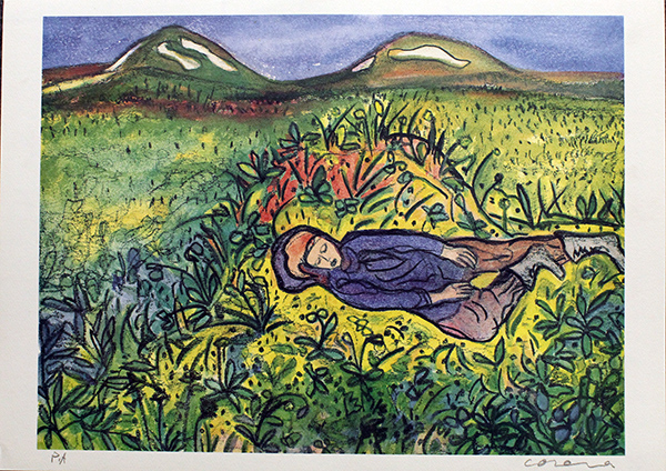 CORONA, anni 90' circa , litografia su cartoncino, cm 49x69, esemplare : P.A. In basso a sinistra Tiratura , in basso a destra firma