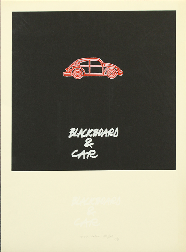 FABIO DE POLI, Blackboard & car, 1976, litografia a colori, cm. 70x50. esemplare Prova Colore. Al fronte: firma, anno, tiratura in basso al centro. Opera senza cornice.