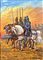 GIOVAN FRANCESCO GONZAGA, "Cavalieri medievali al tramonto", anni '90, serigrafia su tela, cm 70x50. Al fronte: tiratura in basso a sinistra, esemplare 263/300 e firma in basso a destra. Al verso: timbro. Opera con certificato di provenienza della Daliano Ribani Arte. Opera senza cornice.