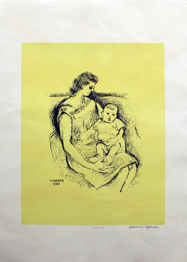 MARCH , "Maternità", 1965, litografia su cartoncino cm , 70x50. Al fronte: firma e timbro in basso a destra, tiratura in basso centrale. Esemplare 100/100. Opera senza cornice