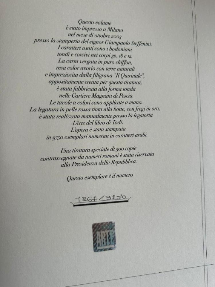 Precedente Lotto 244 Successivo Art Code Casa d'Aste - Via S. Leonardo Palazzo Milara 26, 84131 Salerno Pre-Asta Asta N.35 - Arte Moderna e Contemporanea Sessione unica dal lotto 1 al lotto 279 venerdì 30 gennaio 2026 ore 14:30 (UTC +01:00) FMR, Il palazzo del Quirinale Prezzo di partenza6.000,00 € Accedi per offrire FMRIl palazzo del Quirinalelibro Condizioni di vendita Scarica il documento di Condizioni di Vendita