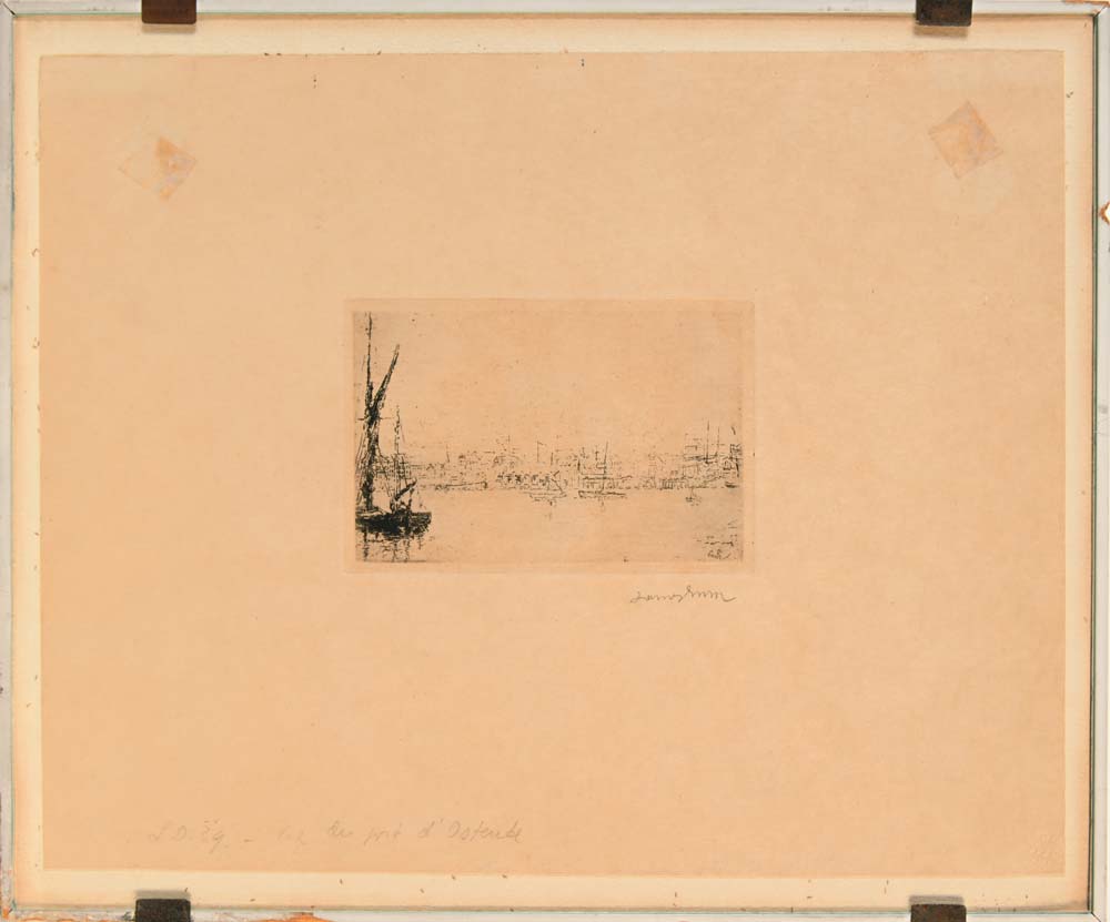 Vue du port d'Ostende 1888 Firma in lastra "Ensor". Firma e titolo a matita "L.d. 34 - Vue du port d'Ostende, James Ensor". Timbro a secco in basso a destra "Libreria Prandi Reggio E.". Incisione lastra cm 7,6x12 - foglio cm 23,5x29,5 - in cornice cm 27x32,5