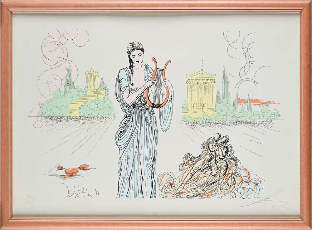 Santa Cecilia con l'arpa Firma e numerazione "Dalì 30/250". Timbro a secco dello stampatore Serigrafia cm 50x70 - in cornice cm 55x75