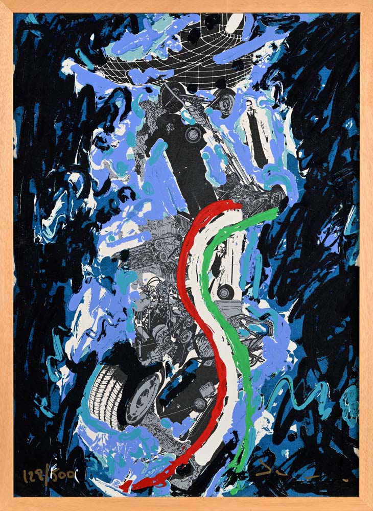 L'automobile 1985 Serigrafia originale di Mario Schifano realizzata nel 1985 dallo stampatore Studio 2R Rinaldo Rossi Genova, per il 40° anniversario de l'Automobile, giornale dell'Automobile Club d'Italia Serigrafia polimaterica cm 69x49 - in cornice cm 72x53