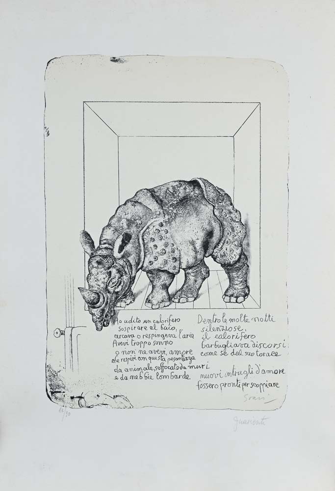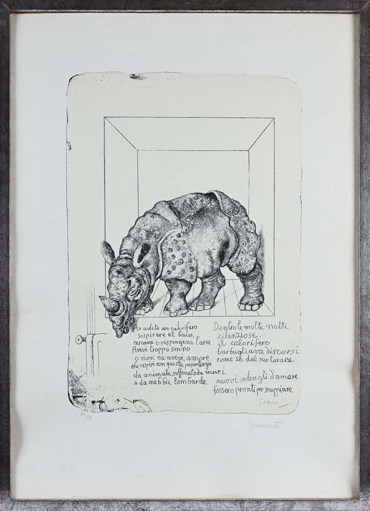 Rinoceronte Litografia di Carlo Guarienti e Poesia di Giorgio Soavi, entrambe firmate "Soavi" e "Guarienti". Numerata in basso a sinistra 83/90 Litografia cm 69x49 - in cornice cm 72x52