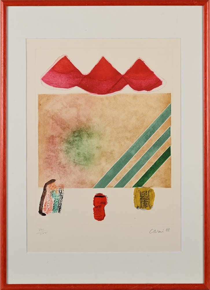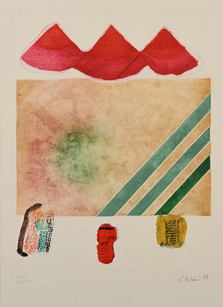 Ispirata ai tre austronauti 1988 Firma, data e numerazione "Carmi '88 VIII/XXV".  Acquatinta cm 65x45 - in cornice cm 70x50
