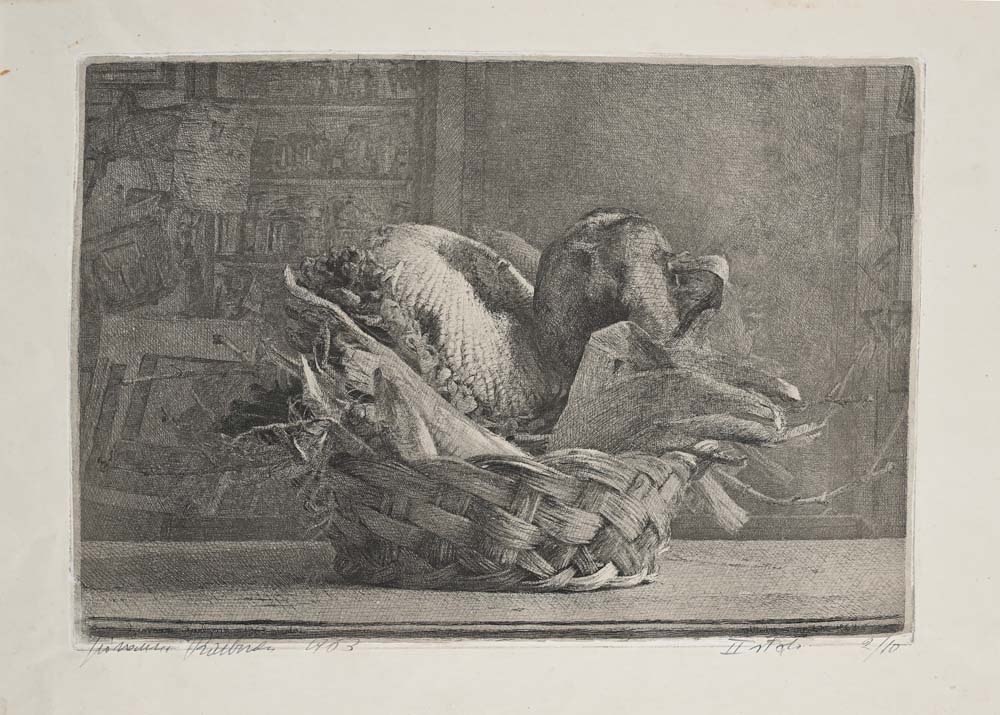Natura morta 1963 Esemplare 2/10, secondo stato. Firma e data in basso a sinistra in lasta e in foglio Acquaforte/acquatinta lastra cm 27x40 - foglio cm 35,5x49,5