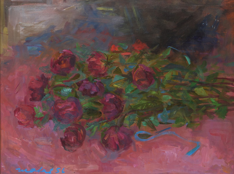 MAFAI MARIO (1902 - 1965) ROSE SDRAIATE SU DRAPPO ROSSO. 1956. Olio su tela. Cm 60,00 x 45,00. firma e data