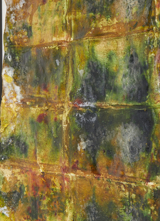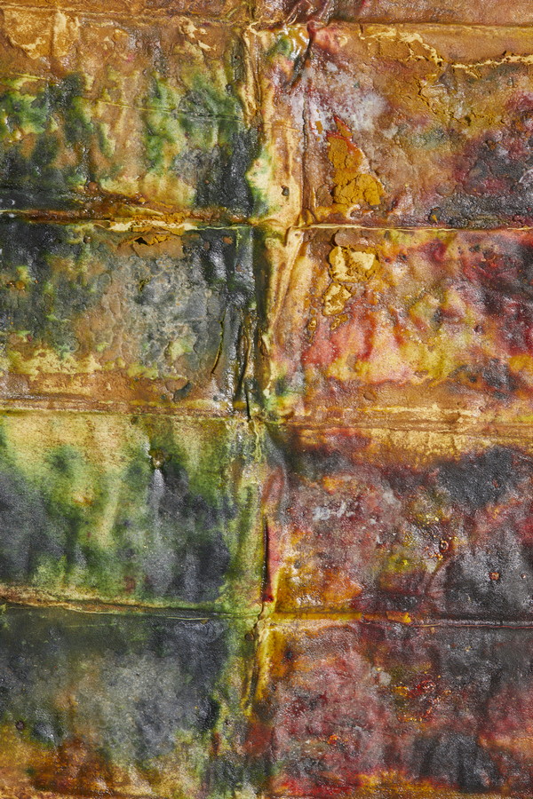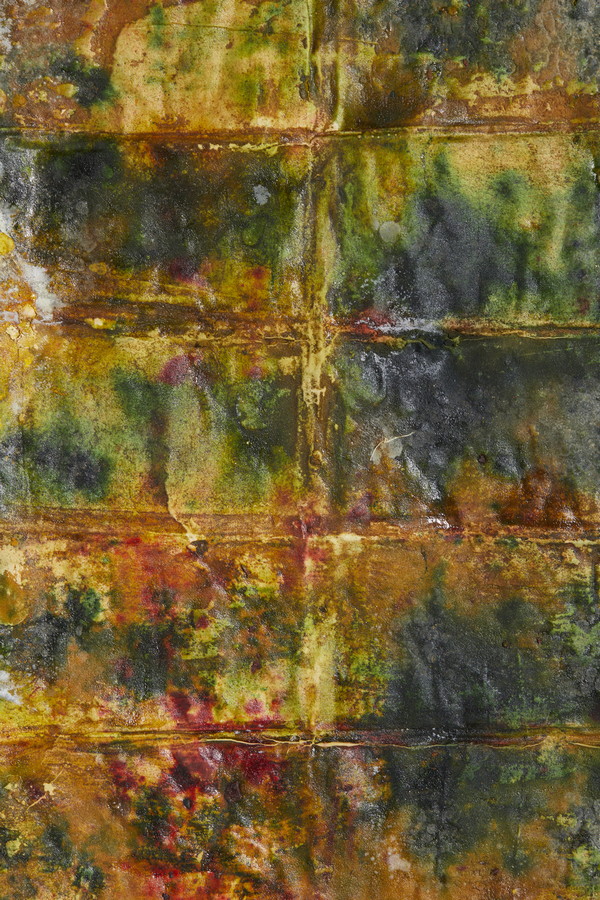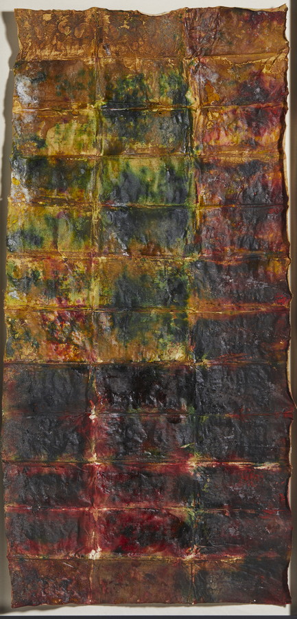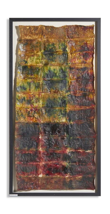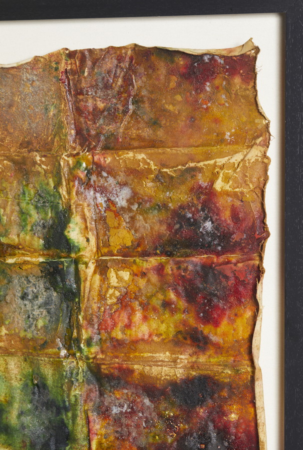 I Cromogrammi, realizzati in studio a partire dal 1965 ed esposti solo dal 1970, sono dipinti immergendo il supporto, carta o tela, in infusi realizzati con pigmenti naturali, e quindi meticolosamente ripiegati più volte su se stessi a formare griglie regolari. Sono così “abbandonati” alle modifiche del tempo, che diventa co-autore della continua e imprevedibile trasformazione dell’opera. (http://renataboero.it/cromogrammi.html). Cornice presente
