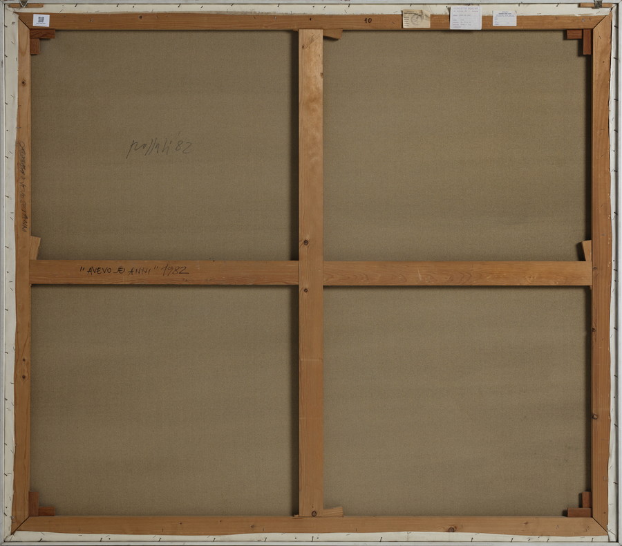 POZZATI CONCETTO (1935 - 2017) AVEVO SEI ANNI . 1982. Tecnica mista e collage di specchio su tela. Cm 200,00 x 175,00. sul retro: firma, data, titolo, etichetta Galleria d'arte moderna, Verona ed etichetta Pozzati, Bologna