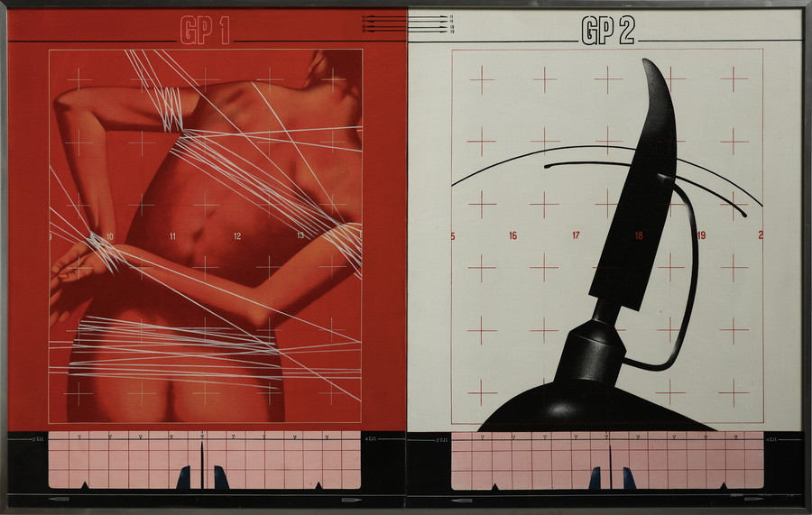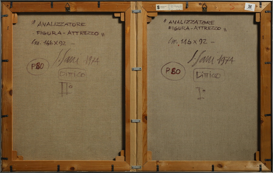 SARRI SERGIO (n. 1938) ANALIZZATORE FIGURA E ATTREZZO . 1974. acrilico su tela. Cm 146,00 x 92,00. sul retro: firma, data, titolo ed etichetta Galleria d'Arte Spagnoli, Firenze