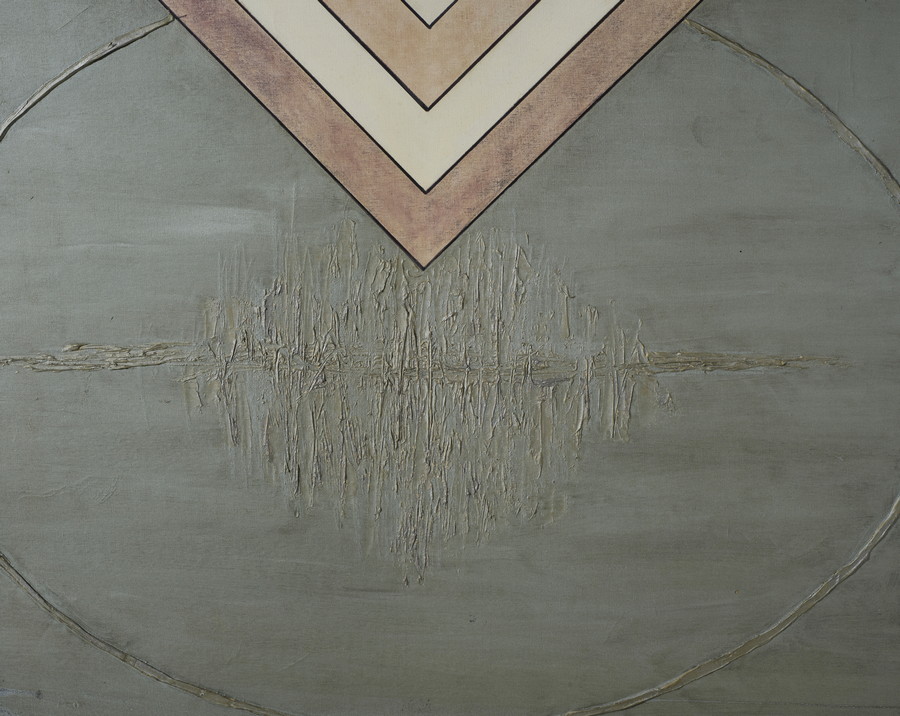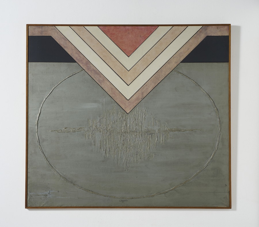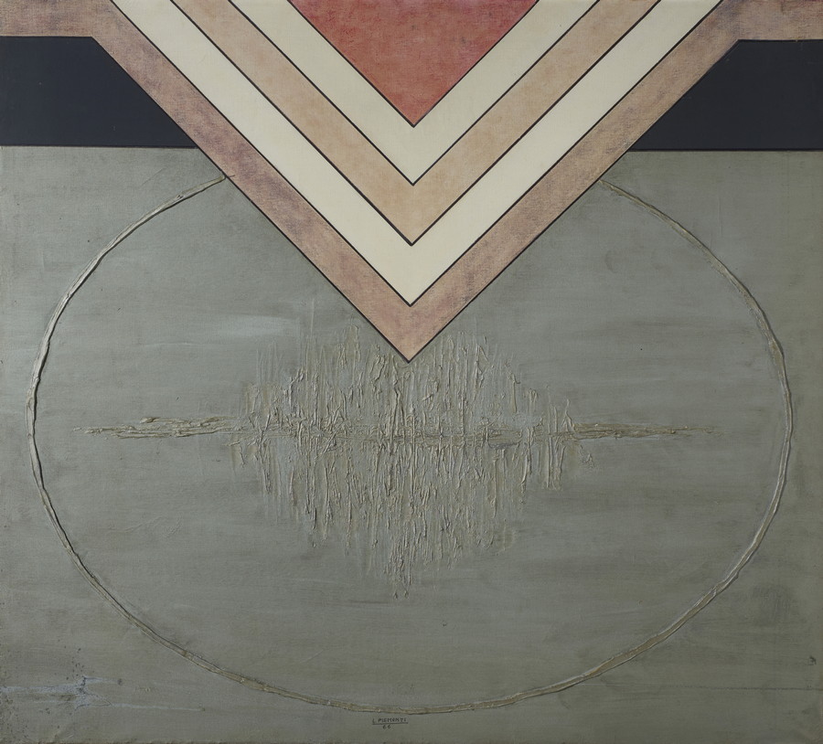 PIEMONTI LORENZO (n. 1935) OVALE ARGENTO. 1966. Tecnica mista e rilievo su tela. Cm 100,00 x 90,00. firma e data