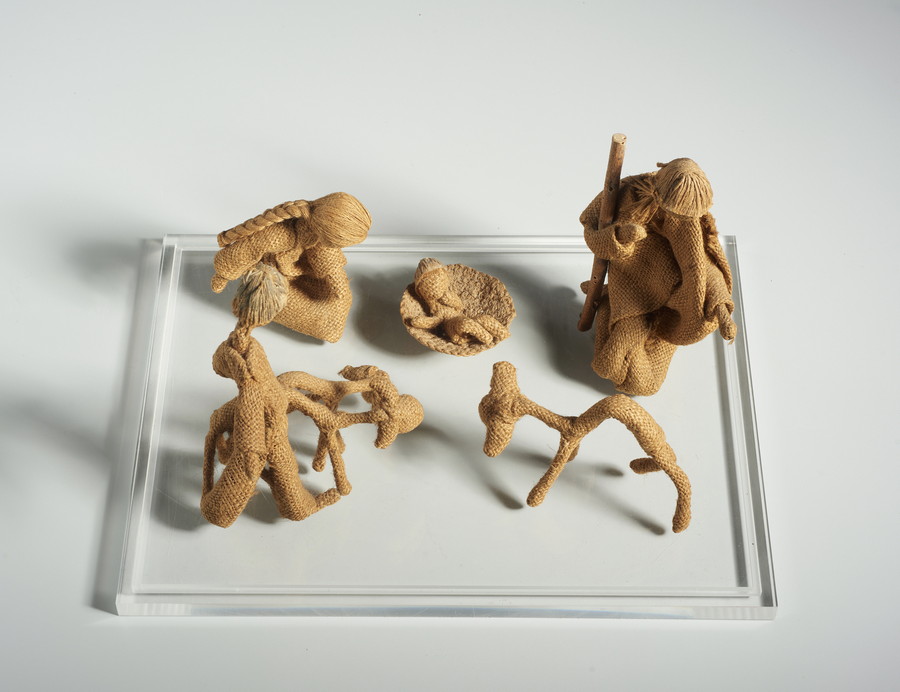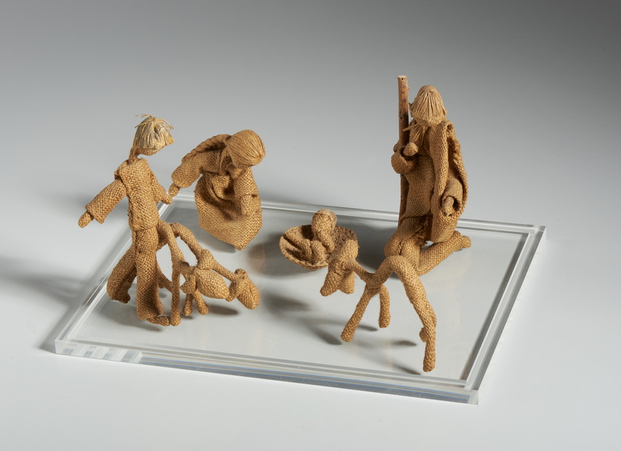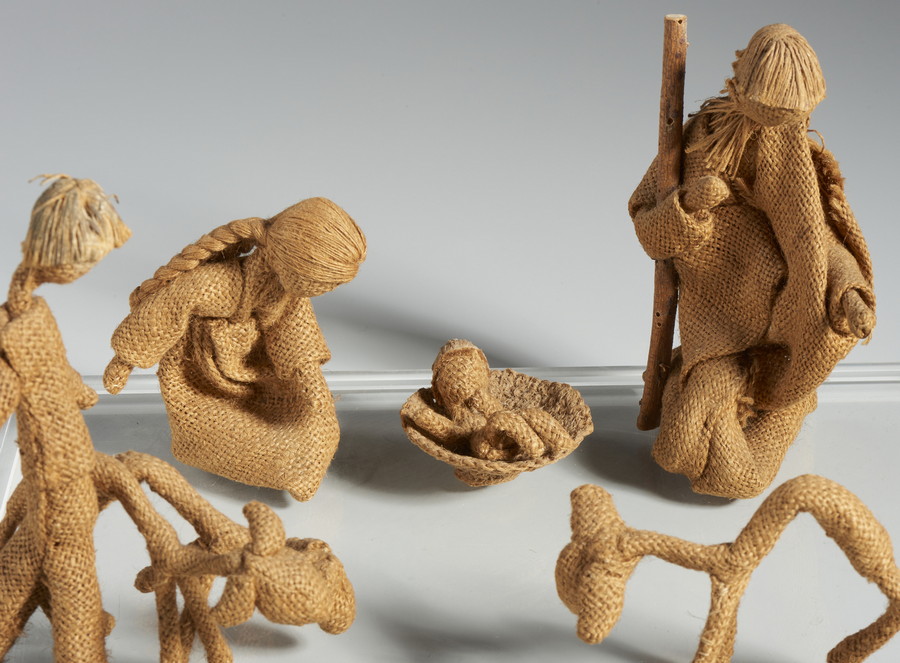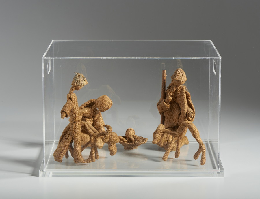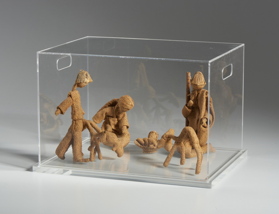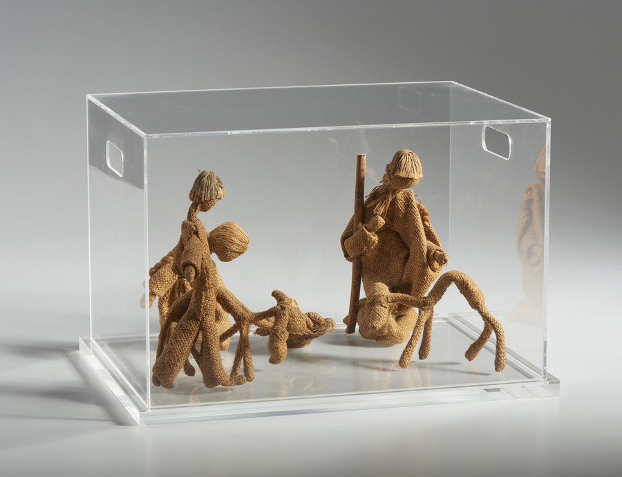 LAI MARIA (1919 - 2013) PRESEPE, ANNI '80. tela di juta, legno, filo. Cm 40,00 x 25,50 x 30,00. entro teca di plexiglass