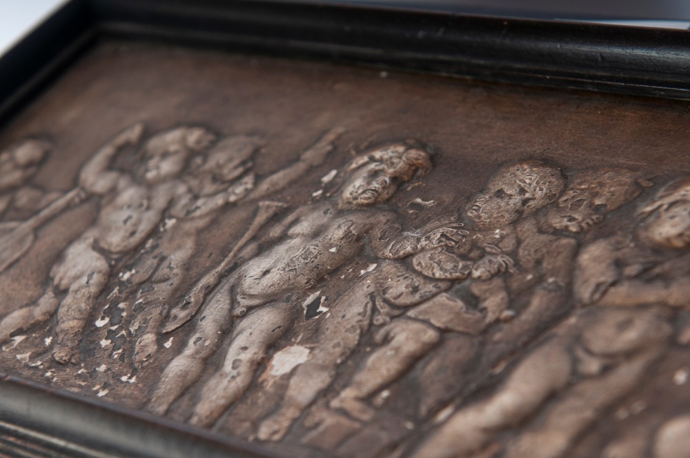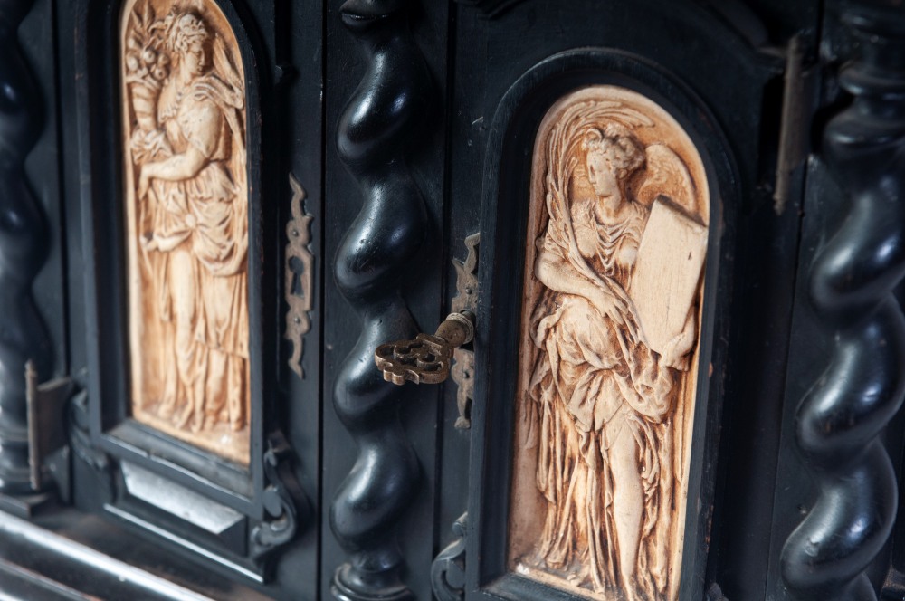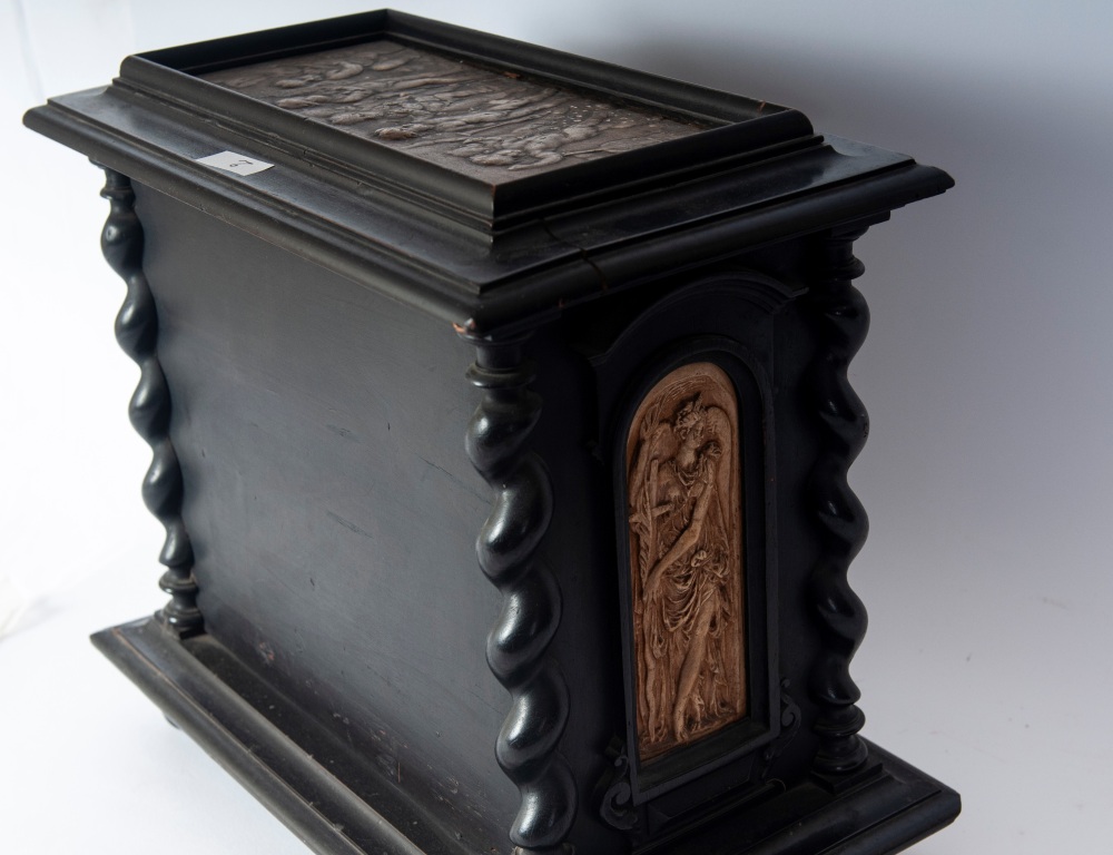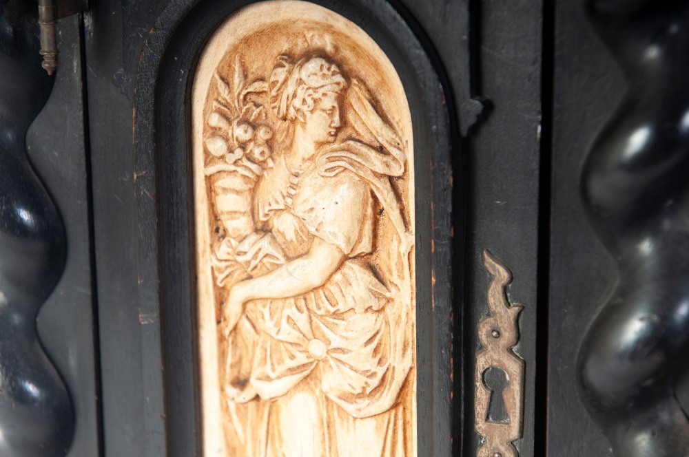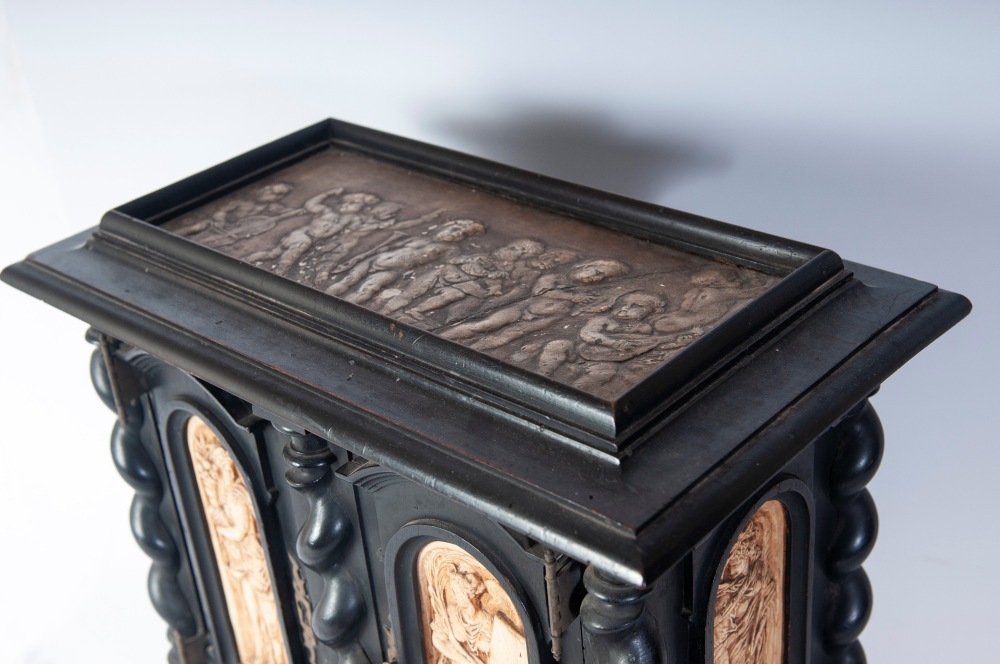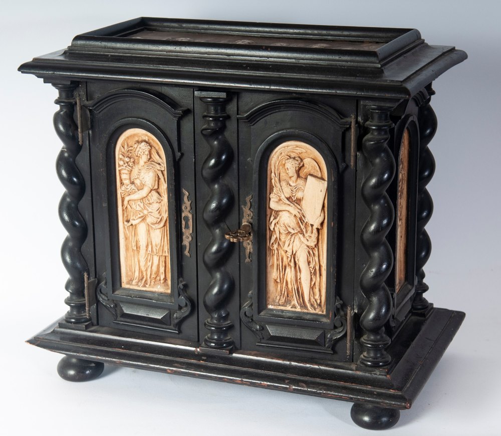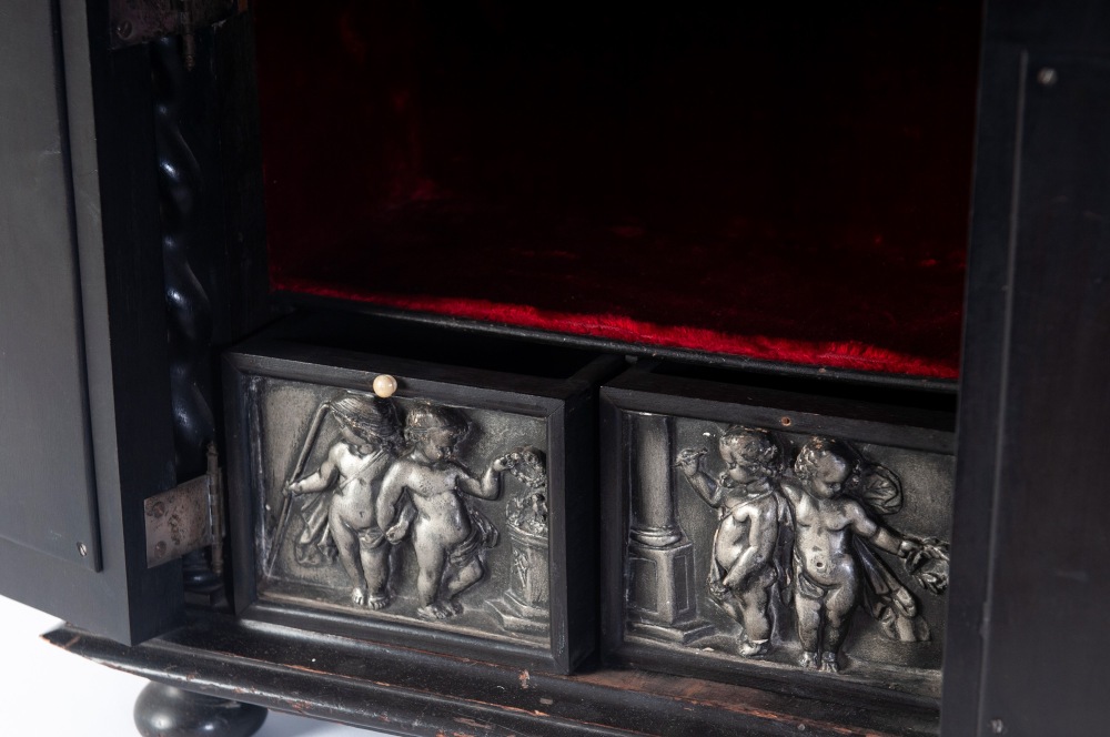 di forma rettangolare con elementi decorativi a colonne tortili, pannellature frontali , laterali e superiori con figure allegoriche ed amorini in pastiglia di gesso bianca. Due sportelli a vantaoux con all'interno due cassetti ed spazio rettangolare. Piede d'appoggio a bottone.