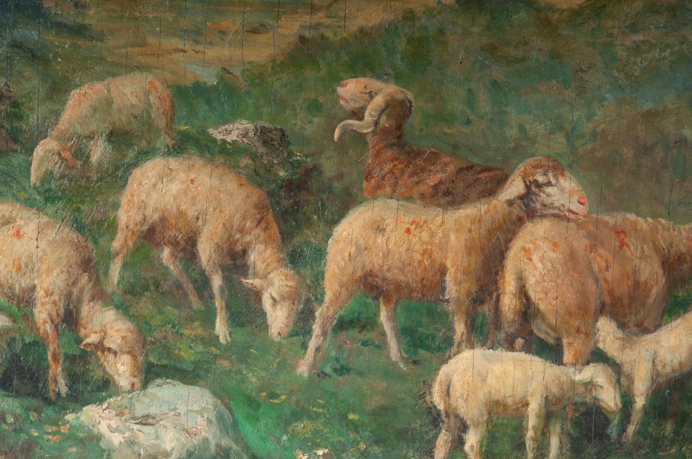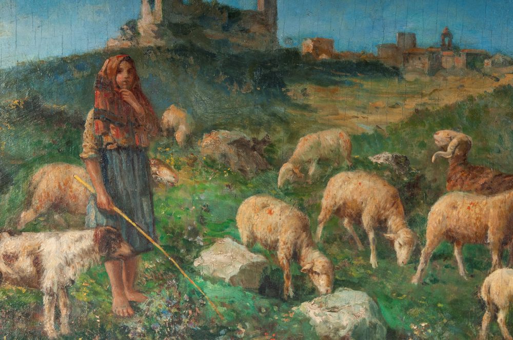 Lotto 8 | Pastorella con gregge fine XIX secolo inizi XX secolo dipinto ad olio su tavola 38 x 60 cm