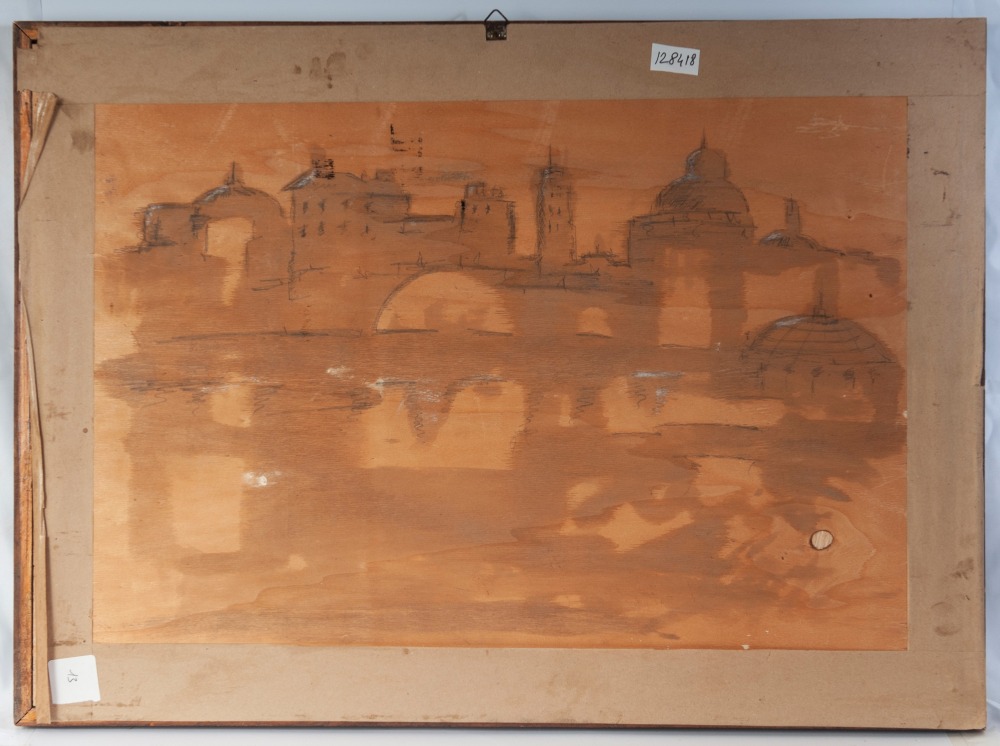 in cornice. Al retro bozzetto di citta'. Scuola italiana della meta' del XX secolo.