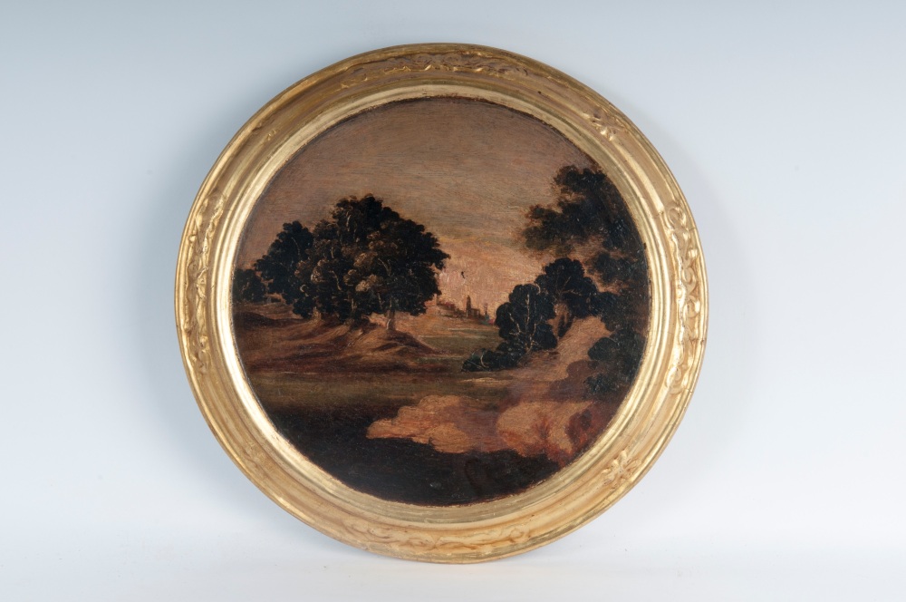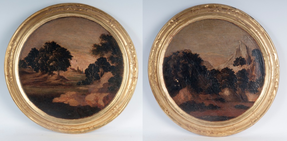 Lotto 14 | Coppia di paesaggi inizio XX secolo dipinti ad olio su tavola ad assetto tondo diametro 35 x 4 cm