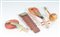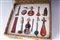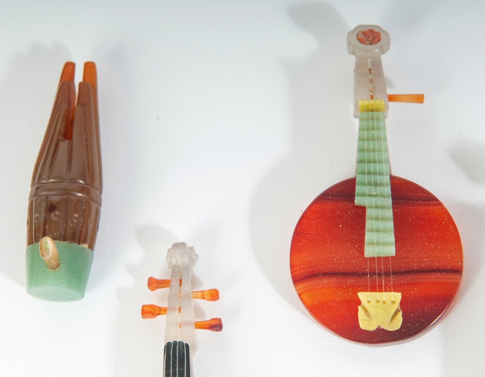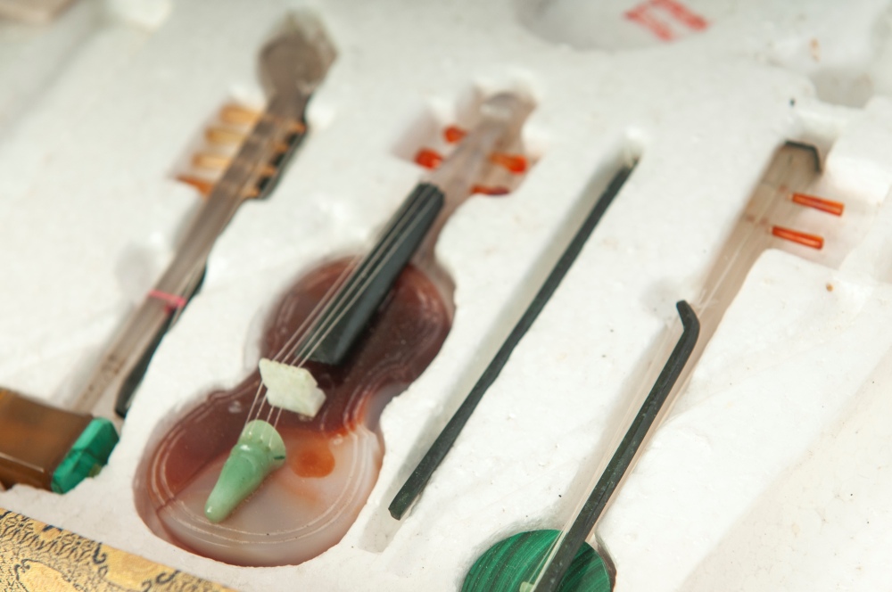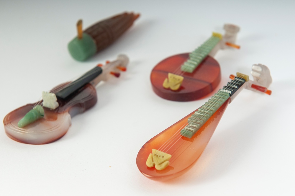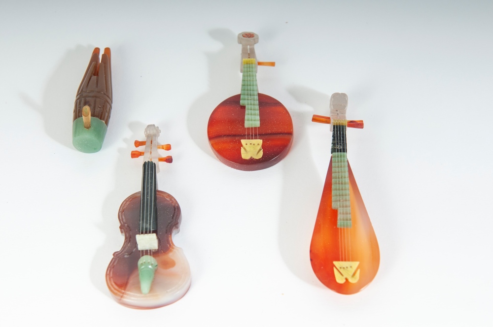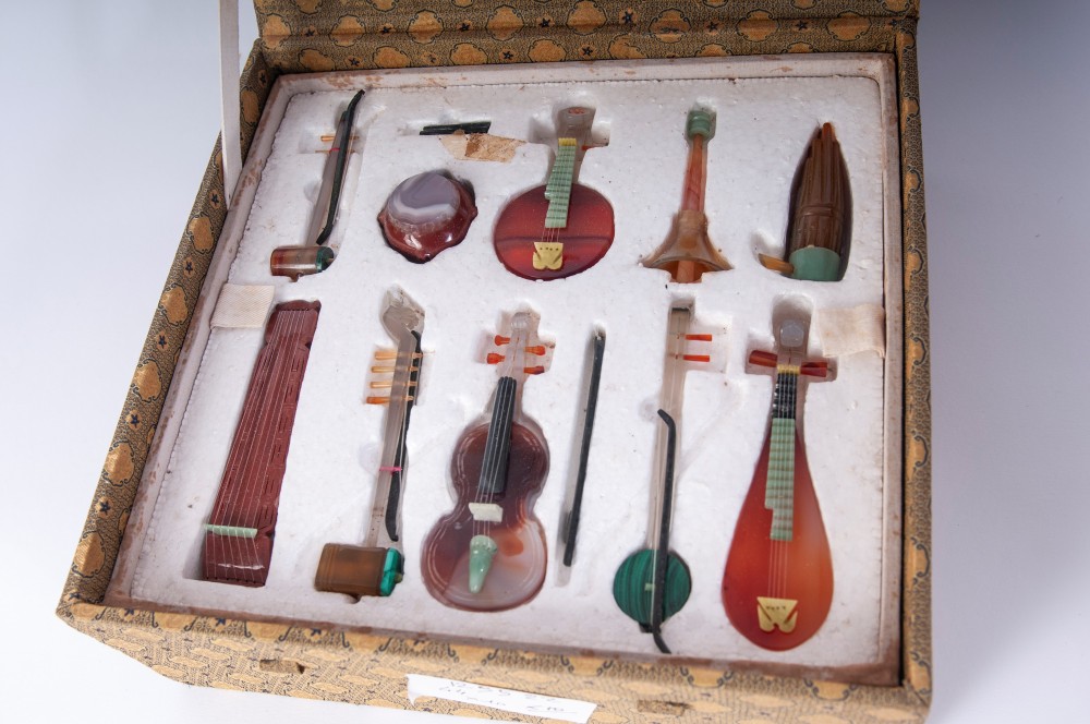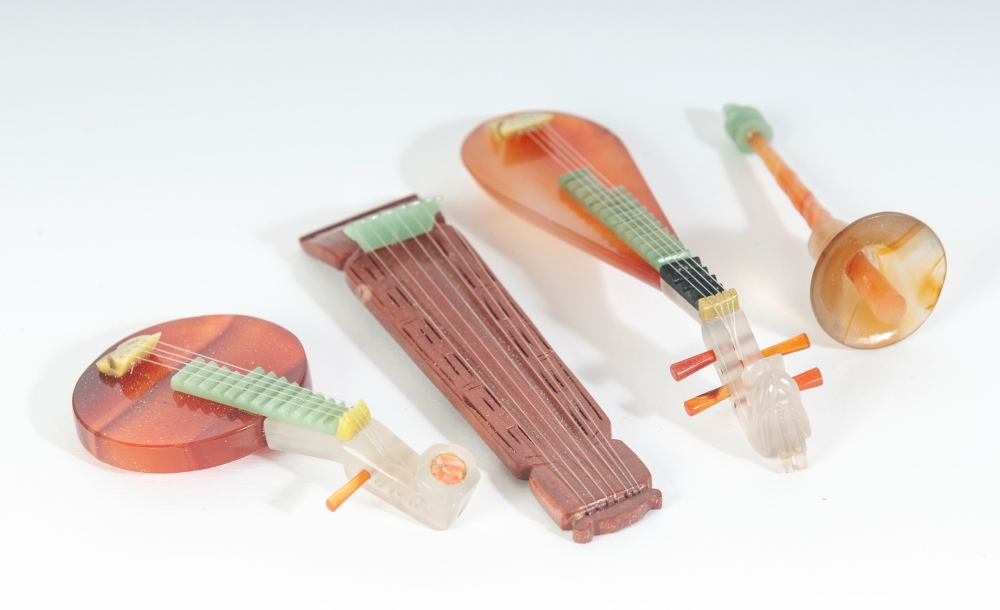 in miniatura in corniola e pietre dure con le rispettive basi entro scatola rivestita in seta originale. pz. 10