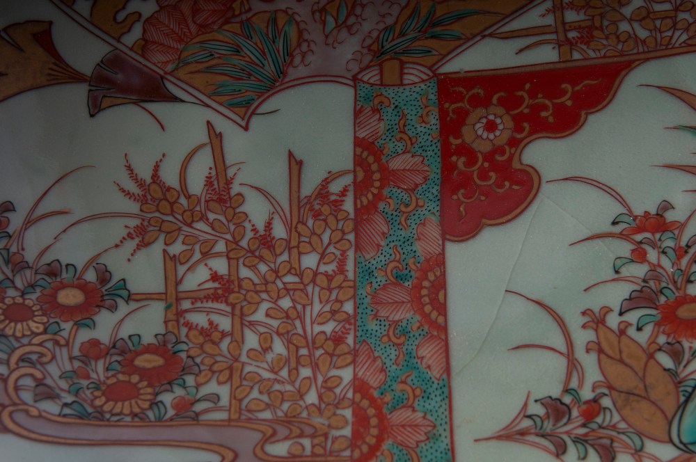 a tutto fondo con decoro Imari a motivi vegetali ed architetture.