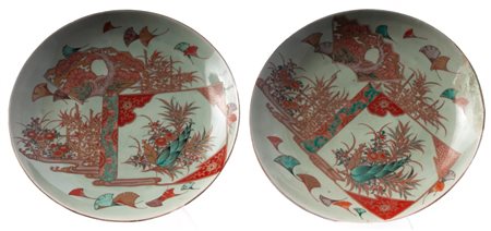 Coppia di piatti in porcellana policroma periodo Meiji 31,5 x 5 cm