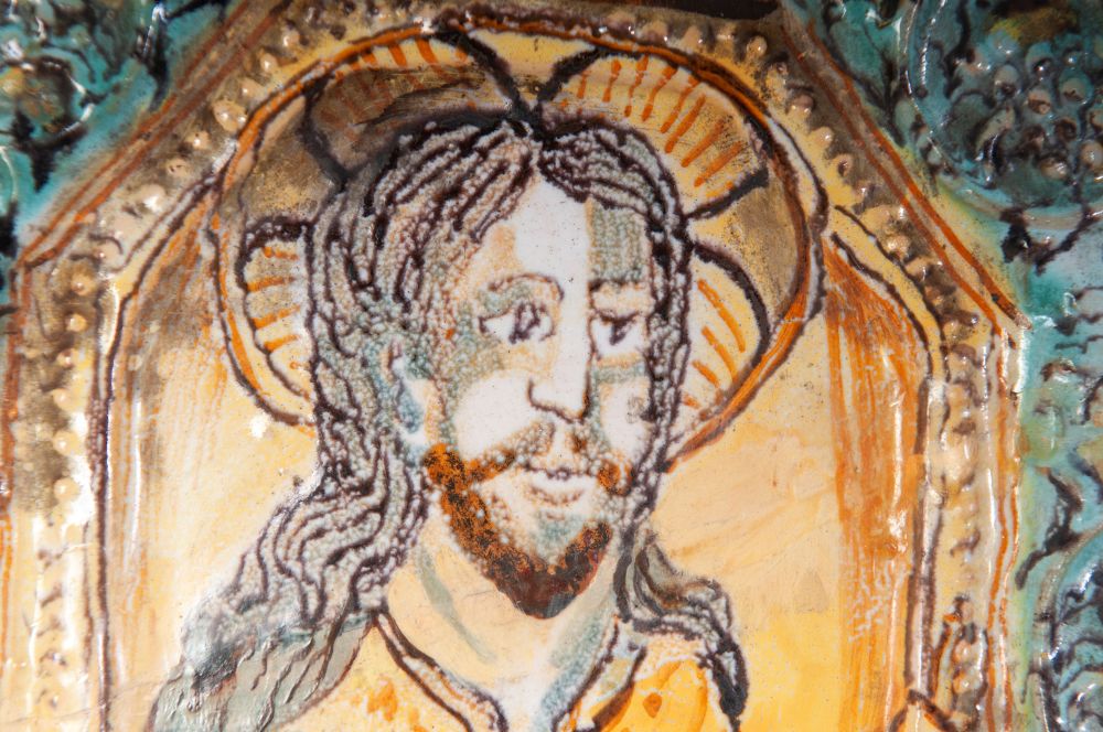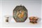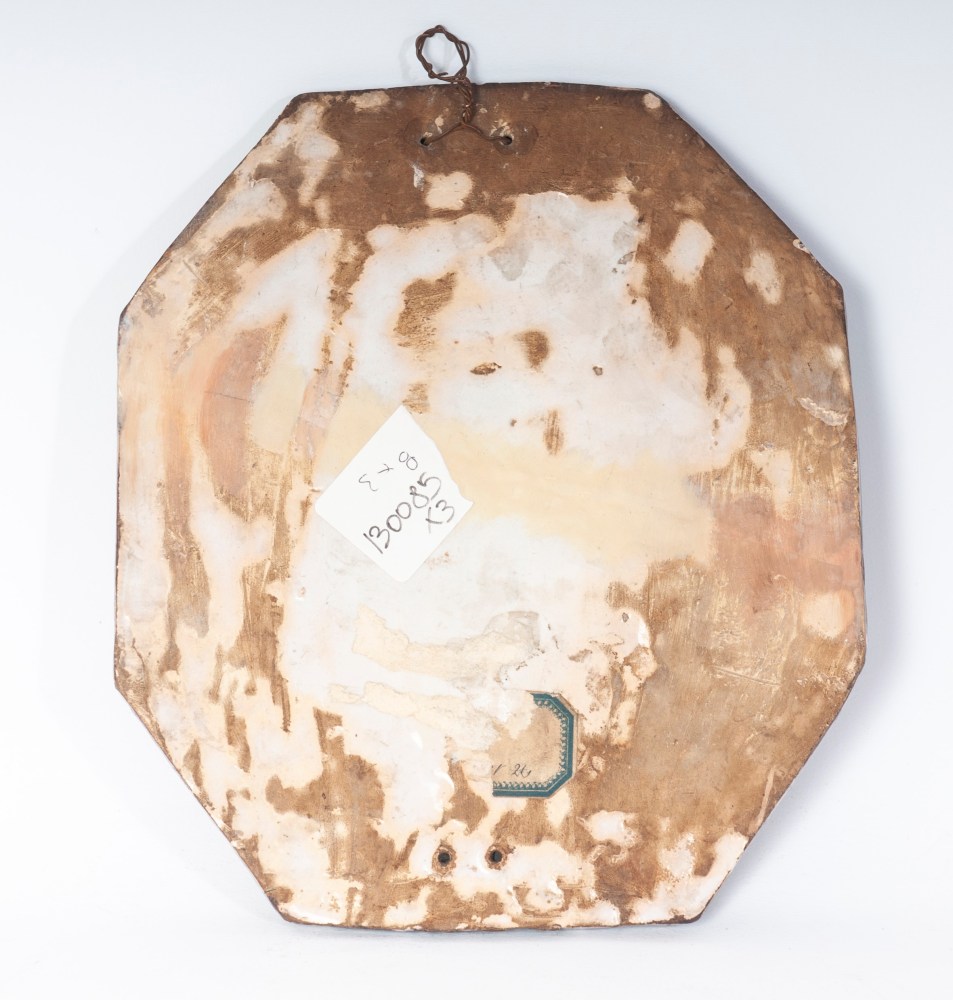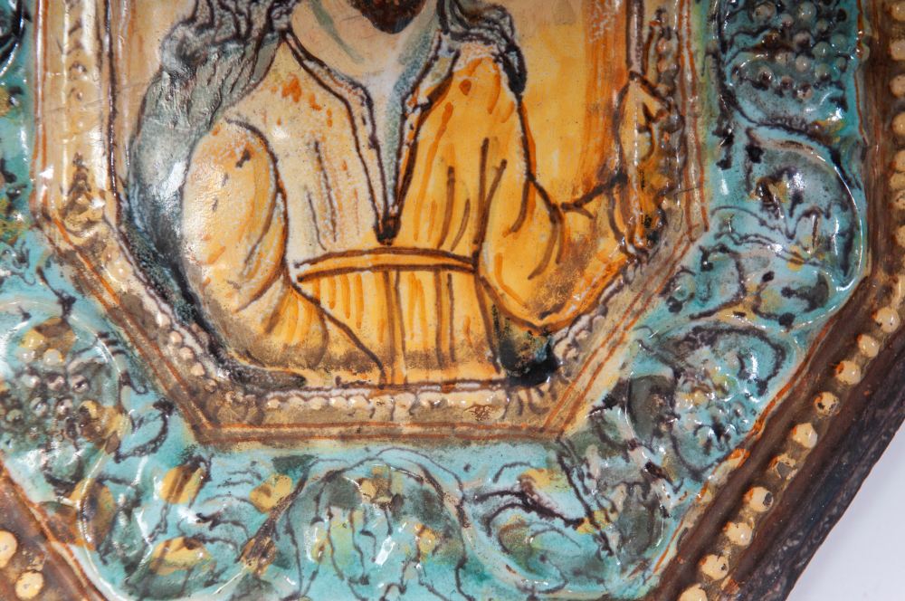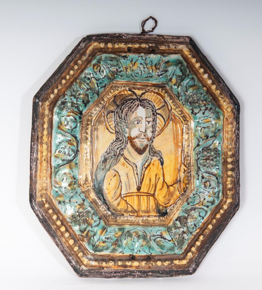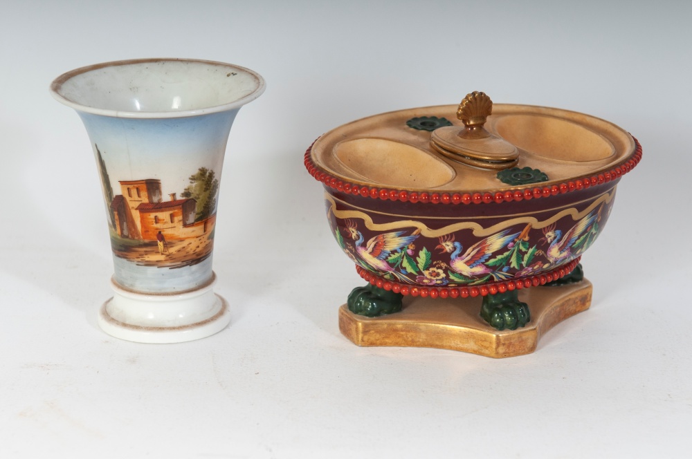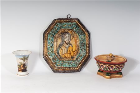 mattonella ottagonale policroma con raffigurazioni di Cristo 25,5 x 22 x 2 cm. Calamaio a tre vasche in porcellana policroma di forma ovale poggiante su quattro piedini zoomorfi con decoro a volatili su fondo bordeaux . Vasca centrale superiore con coperchio e finiture in oro zecchino 8 x 14,5 x 12. Vasetto a tromba in porcellana con decoro di paesaggio a tutto campo su fondo azzurrato 10,5 x 8,8 x 5,4 cm