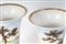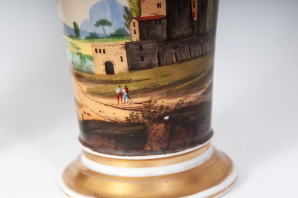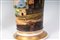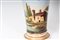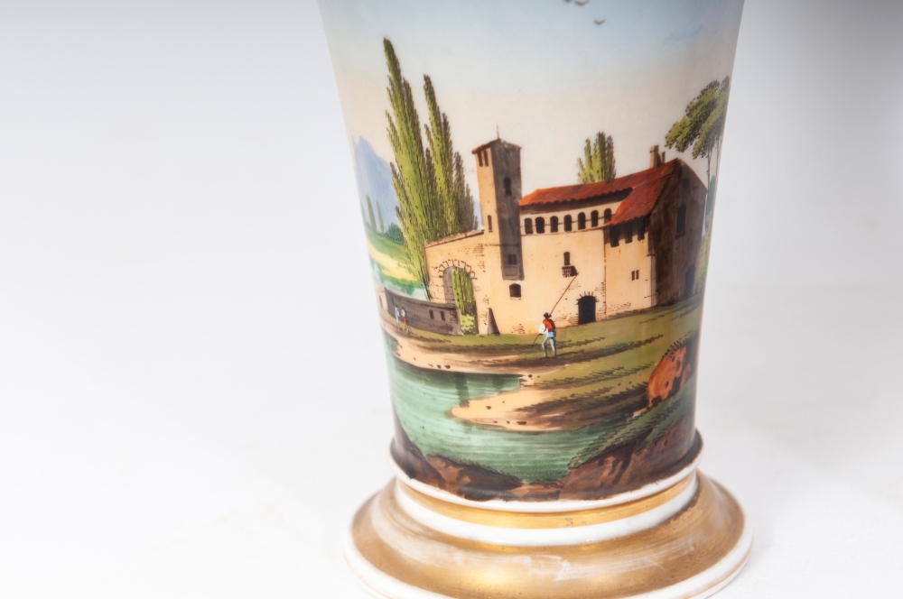 in porcellana policroma. Base da appoggio a disco con fondo ribassato. Decoro con paesaggio a tutto tondo su fondo azzurrato, finiture in oro zecchino.