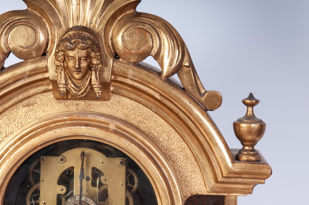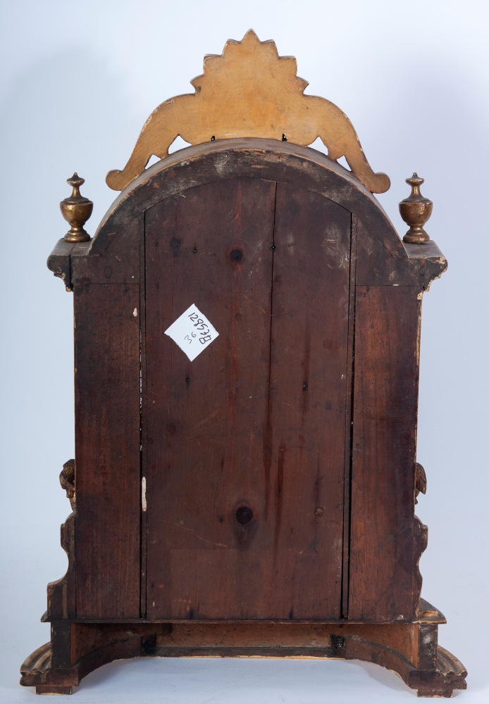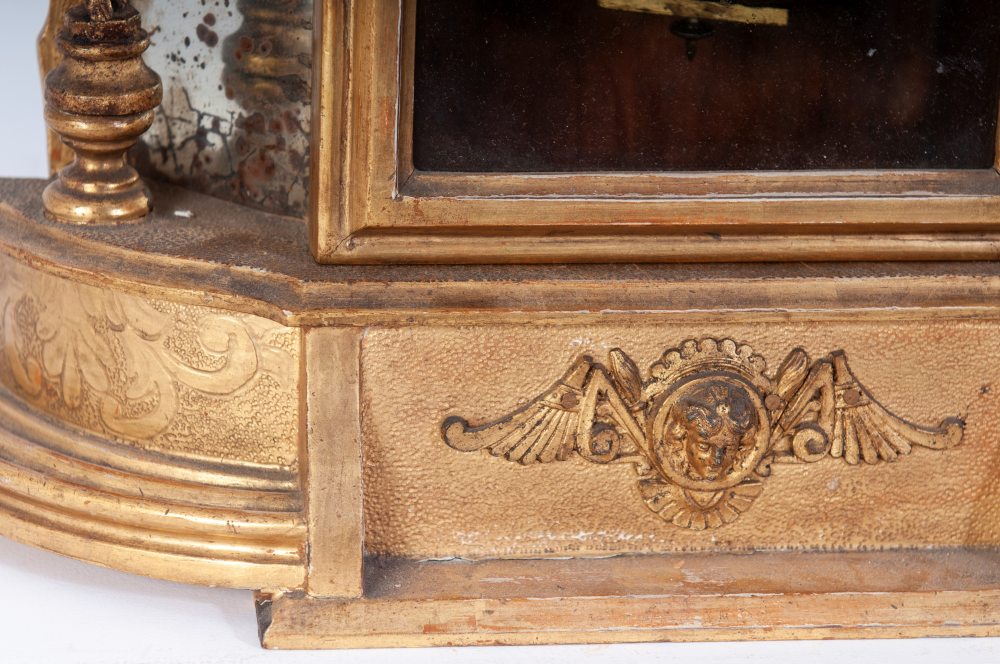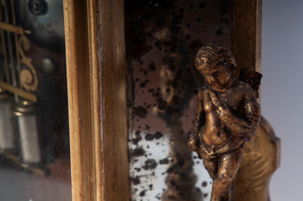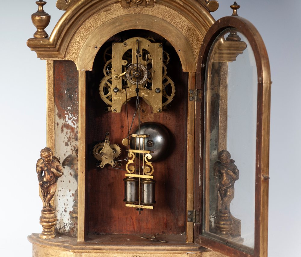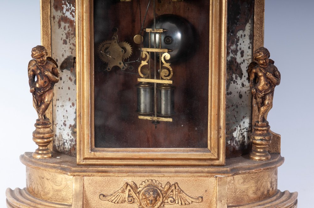 61 x 35 x 13 cm meccanismo a pendolo con distanziatore a fascia. Ripetizione dell'ore e delle mezz'ore. Cassa in legno dorata a bacheca con elementi decorativi a forma di putto in metallo dorato. Macchina non testata e firmata Ansonia clock e co