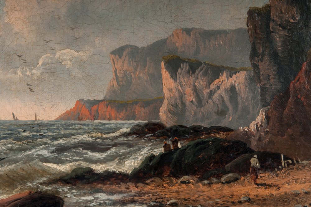 Paesaggio con scogliera e barche fine XIX inizi XX secolo dipinto ad olio su tela 38,5 x 51 cm