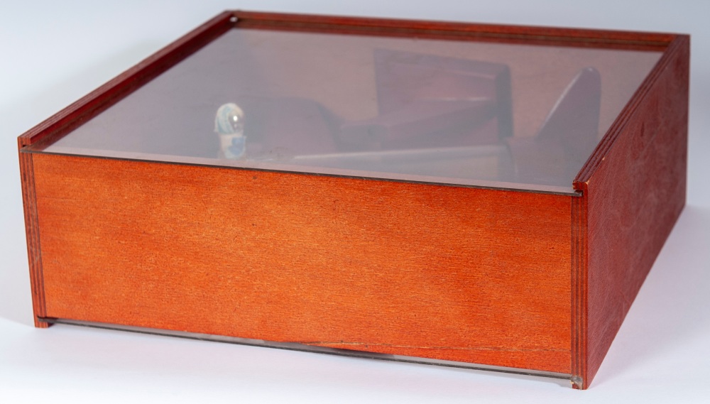 30 x 31,5 x 11,5 cm pubblicitario per la grappa Mazzetti entro teca.