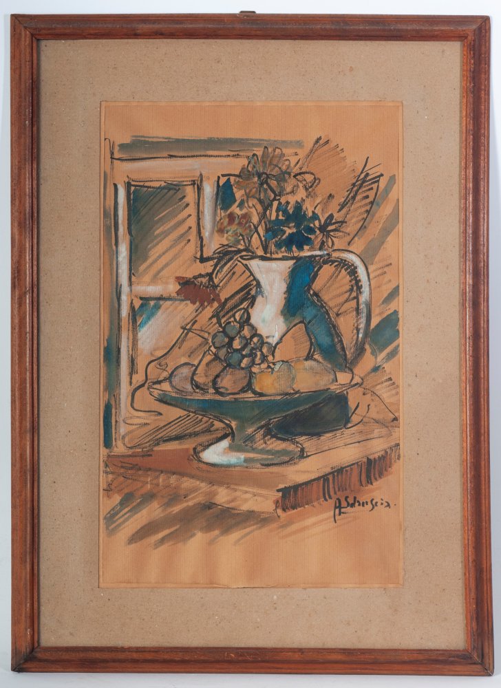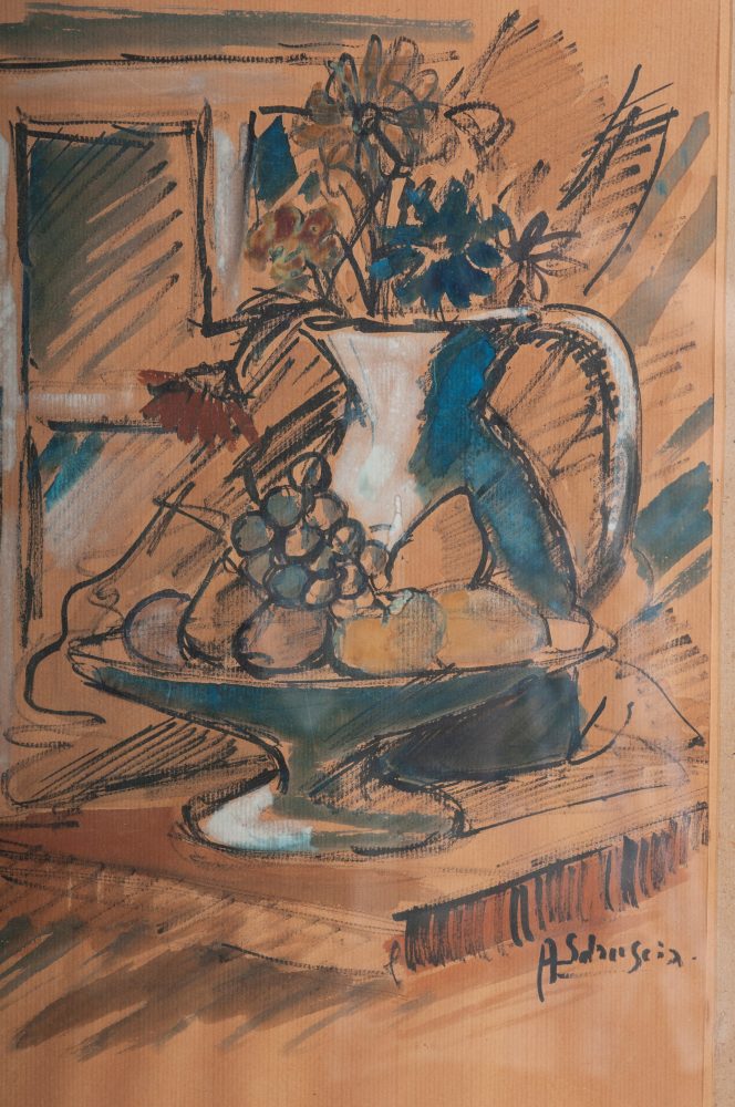 ACHILLE SDRUSCIA (Roma, 1910 - 1994) Natura silente, frutta e vasellame Tecnica mista su carta 50 x 30 cm