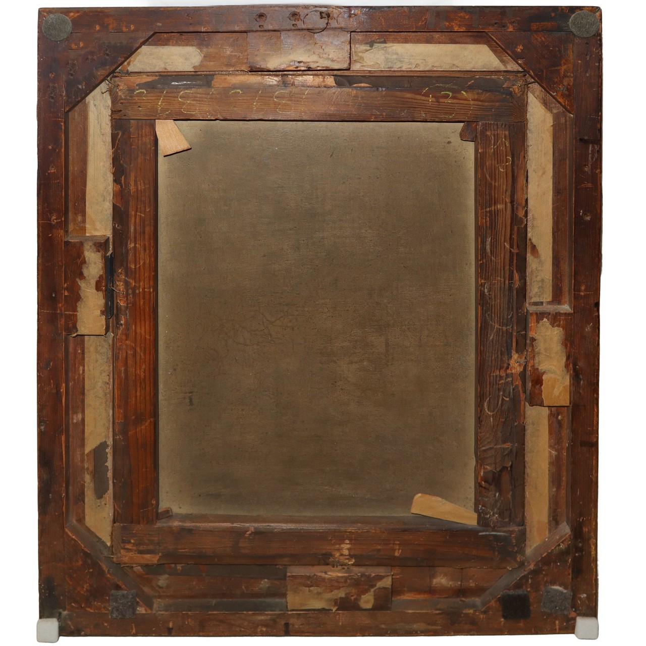 Dipinto ad olio su tela raffigurante Paesaggio con alberi e personaggi., Fine 17° secolo H CM 52,5x41 IN CORNICE H CM 68x56