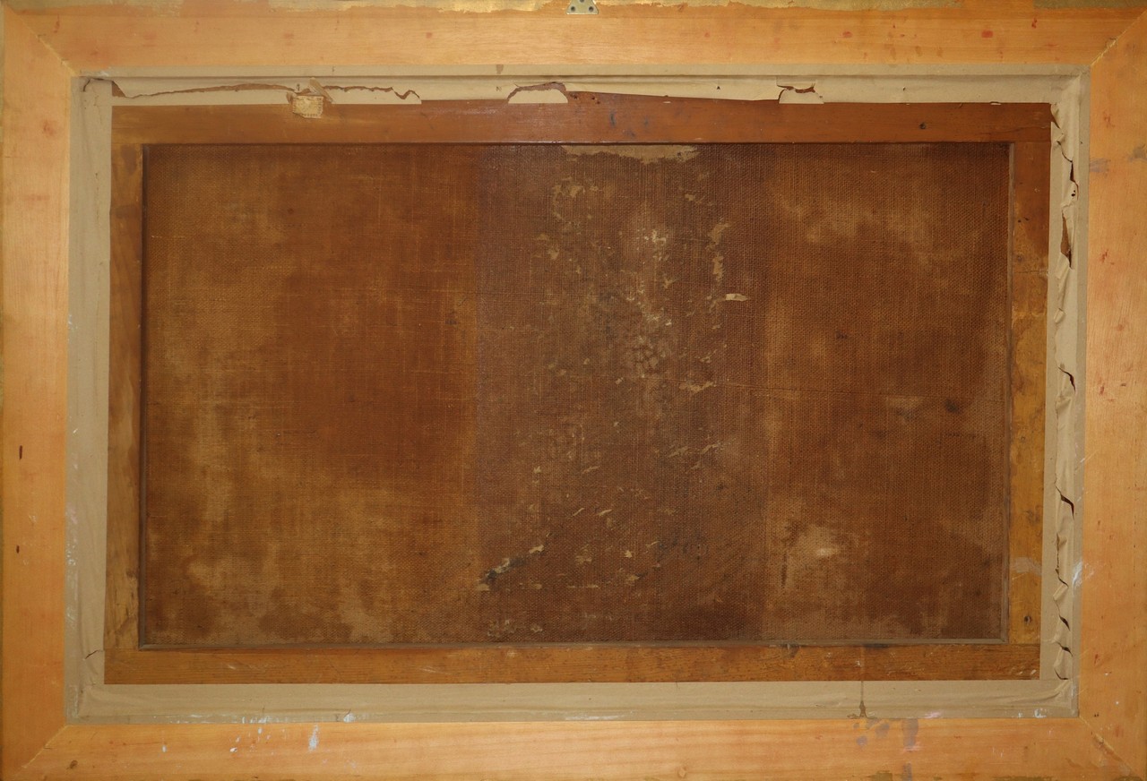 Scena biblica: Vengono mostrati i panni insanguinati di Giuseppe a Giacobbe dopo essere stato gettato nel pozzo dai fratelli, primi 18° secolo H CM 74x100 in cornice h cm 81X117 olio su tela