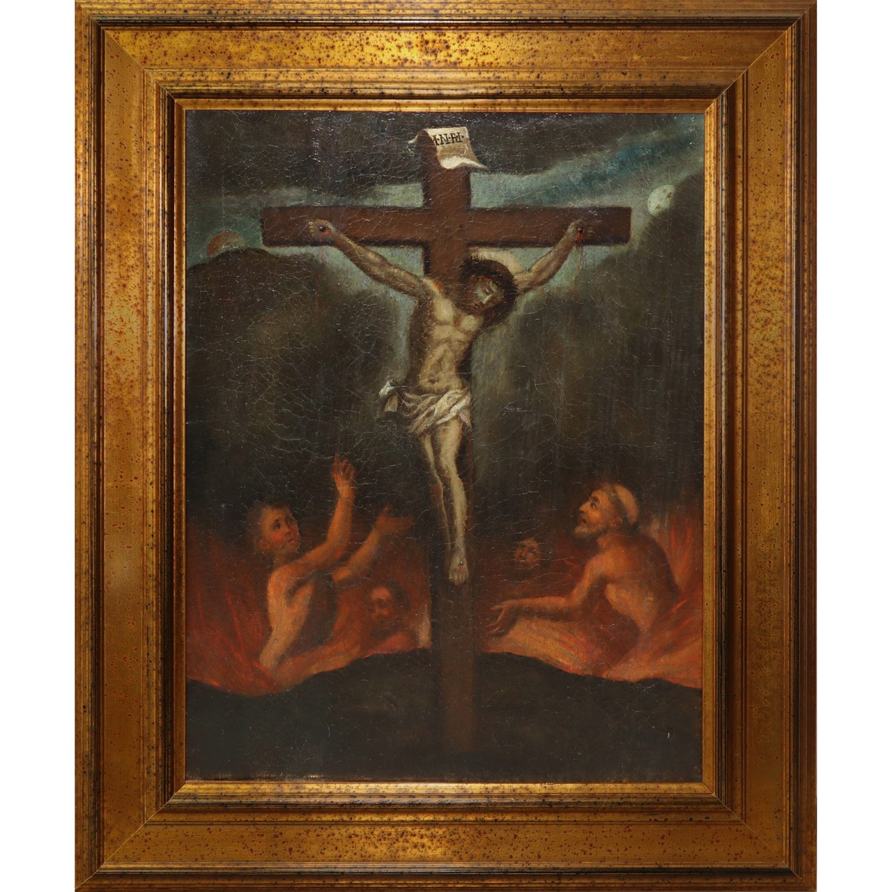 Gesù Cristo in croce con le anime purganti alla base, 18° secolo painter H cm 53x41 - in cornice H cm 70x57 Olio su tela