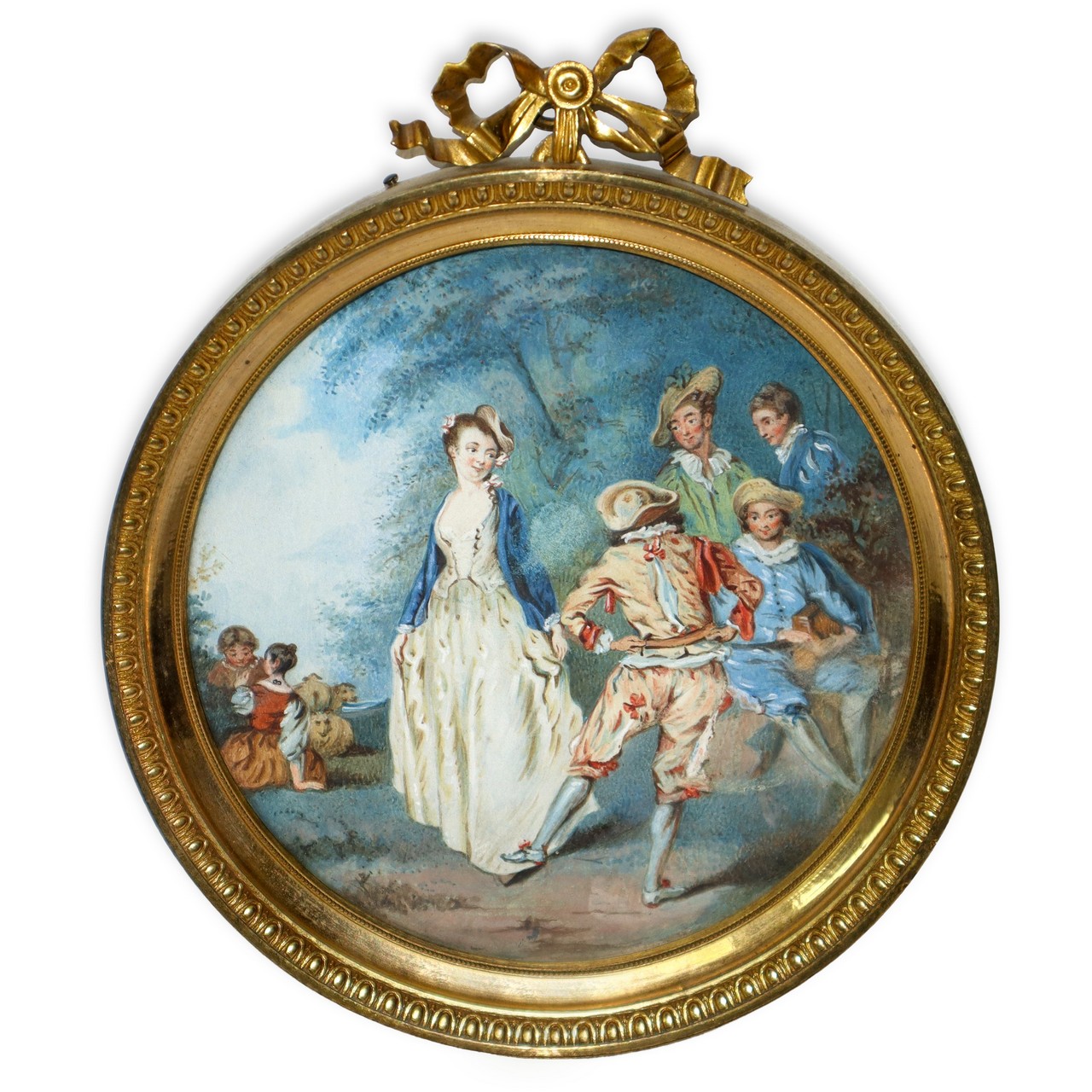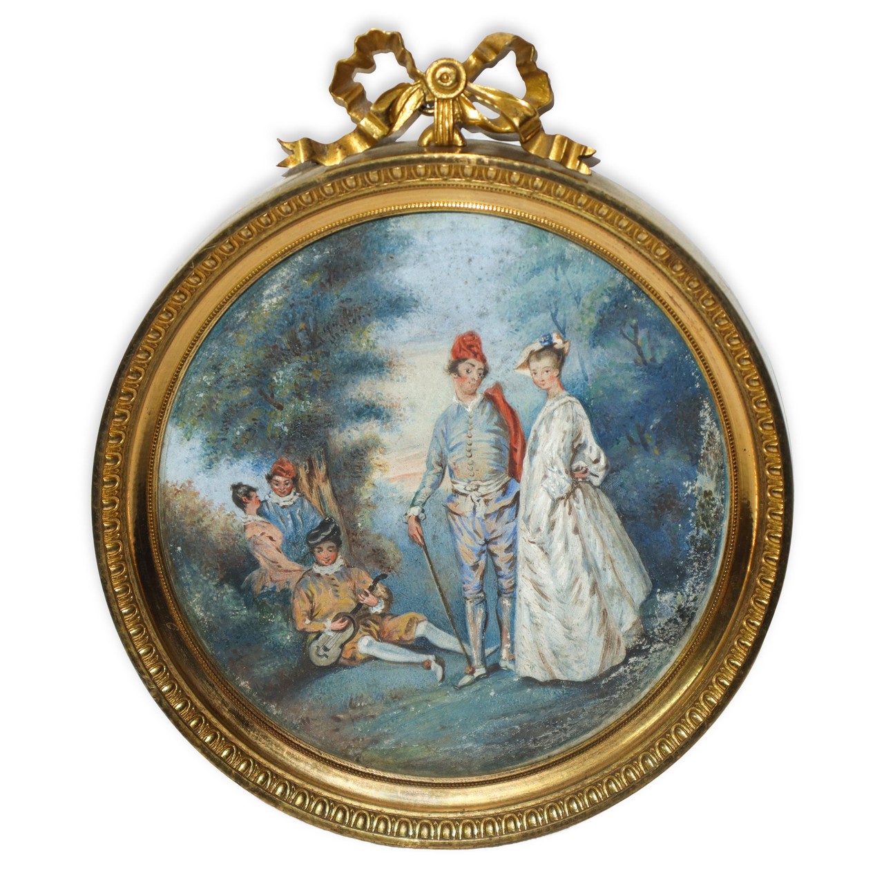 Coppia di scene di genere entro cornice dorata circolare con fiocco sulla parte sommitale, 18° secolo